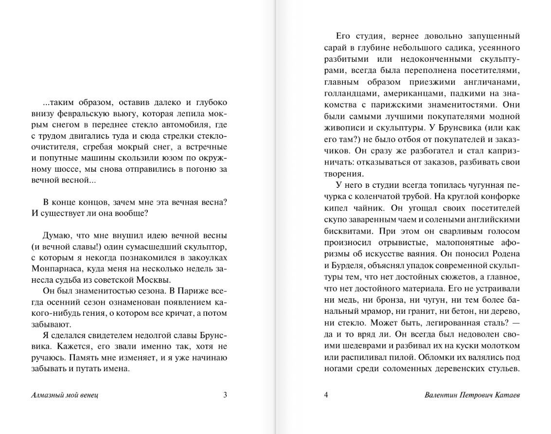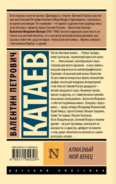 In his novel "My Diamond Crown," Valentin Kataev describes specific facts from his personal life and recreates a panorama of literary (and other!) life in Russia in the 1920s and early 1930s. Extracting characters, one by one, from the "mysterious convolutions of the imagination," Valentin Petrovich "avoids real names." He gives each "character"—including Vladimir Mayakovsky, Yuri Olesha, Sergei Yesenin, Mikhail Zoshchenko, Boris Pasternak, Mikhail Bulgakov, Osip Mandelstam, Yevgeny Petrov, and many others—nicknames, describes their appearance and character, and recites poems from memory, giving readers the opportunity to solve the riddles themselves.