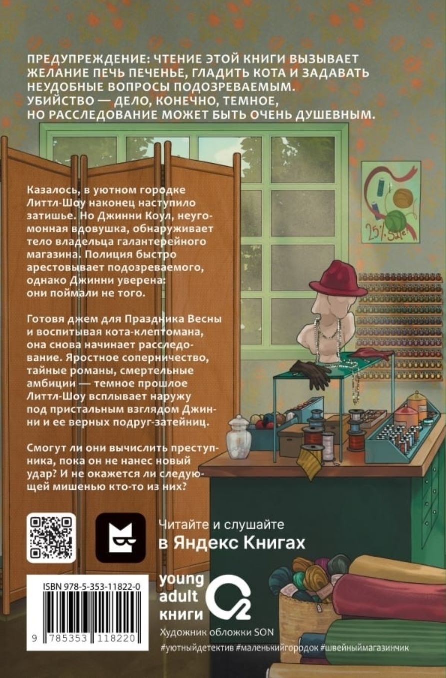 Little Shaw seemed to have finally settled down. But Ginny Cole discovers another dead body! The owner of a haberdashery store has been murdered. The police quickly arrest a suspect, but Ginny is certain they've caught the wrong one. While making jam for the Spring Festival and raising a kleptomaniac cat, the restless widow begins her investigation again.