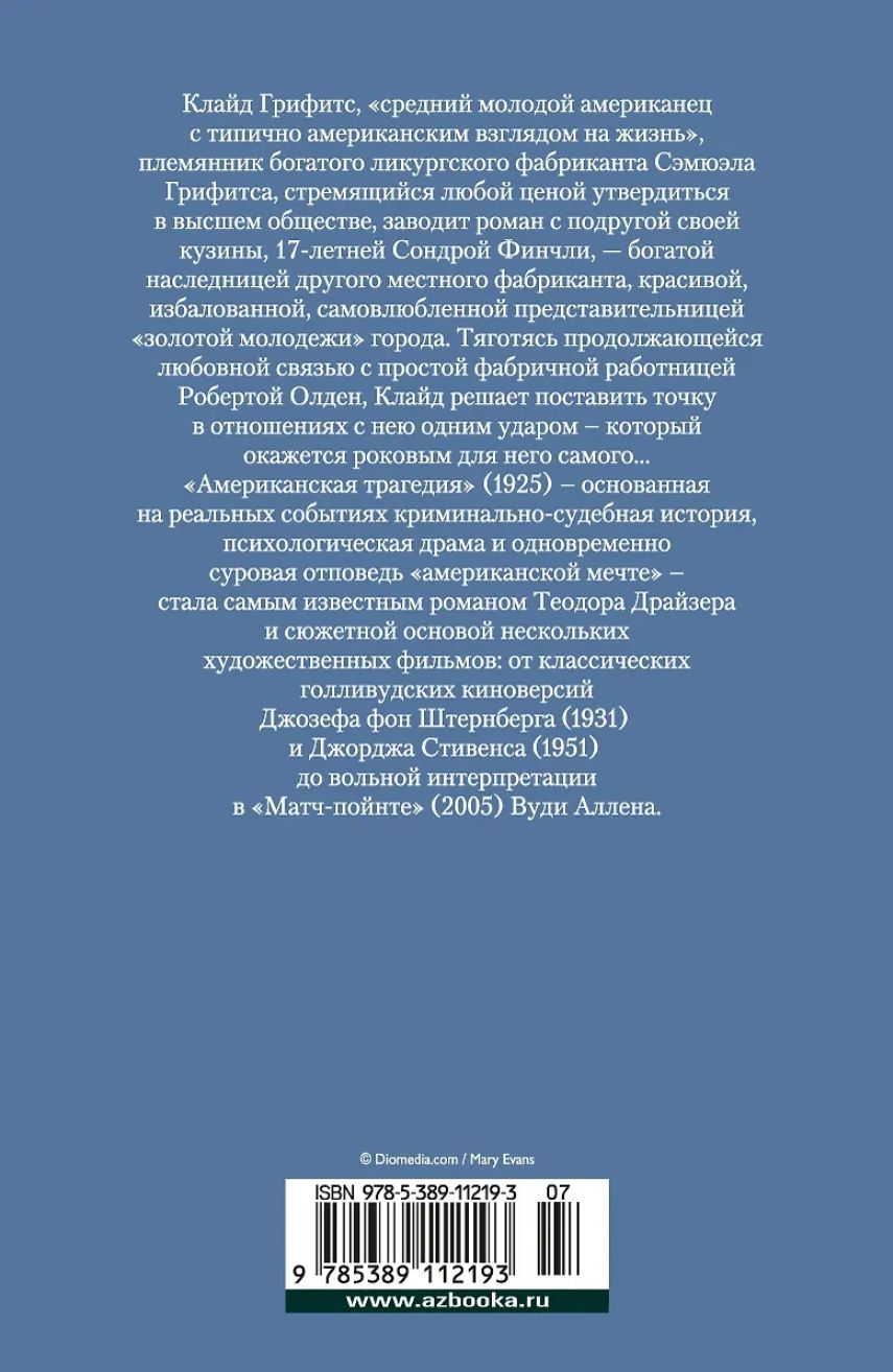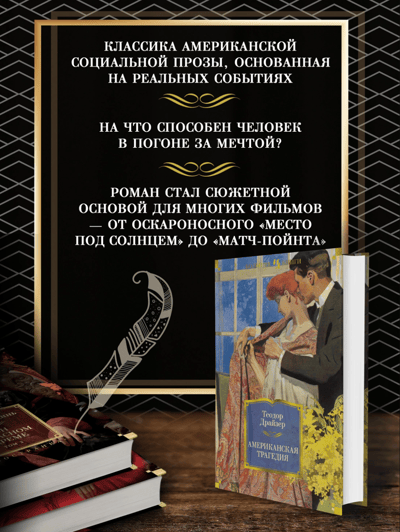 Clyde Griffiths, "an average young American with a typically American outlook on life," the nephew of a wealthy Lycurgus manufacturer, Samuel Griffiths, who is striving to establish himself in high society at any cost, begins an affair with his cousin's friend, 17-year-old Sondra Finchley, a wealthy heiress of another local manufacturer, a beautiful, spoiled, narcissistic representative of the city's "golden youth." An American Tragedy (1925) – a true crime story, a psychological drama and at the same time a harsh rebuke to the “American dream” – became Theodore Dreiser’s most famous novel and the basis for several feature films: from the classic Hollywood film versions by Josef von Sternberg (1931) and George Stevens (1951) to the free interpretation in Woody Allen’s Match Point (2005).