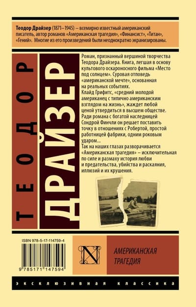 The book that formed the basis of the Oscar-winning cult movie A Place in the Sun. A harsh rebuke to the "American dream", based on real events. Clyde Griffiths, "an average young American with a typically American outlook on life," is eager to establish himself in high society at any cost. For the sake of an affair with wealthy heiress Sondra Finchley, he decides to put an end to his relationship with Roberta, a simple factory worker, with one fatal blow... Thus begins to unfold before our eyes "American Tragedy" - an exceptional in strength and scope story of love and betrayal, murder and remorse, illusions and their collapse.