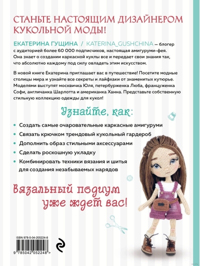 In her new article, popular blogger Ekaterina Gushchina invites you behind the scenes of the knitted fashion week. Visit the fashion capitals of the world and learn all the secrets and life hacks from famous couturiers. The models will be Yulia from Moscow, Lyuba from St. Petersburg, Sophie from France, Hannah from the USA and Charlotte from England. Imagine your own stylish collection of clothes for dolls!