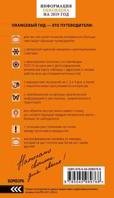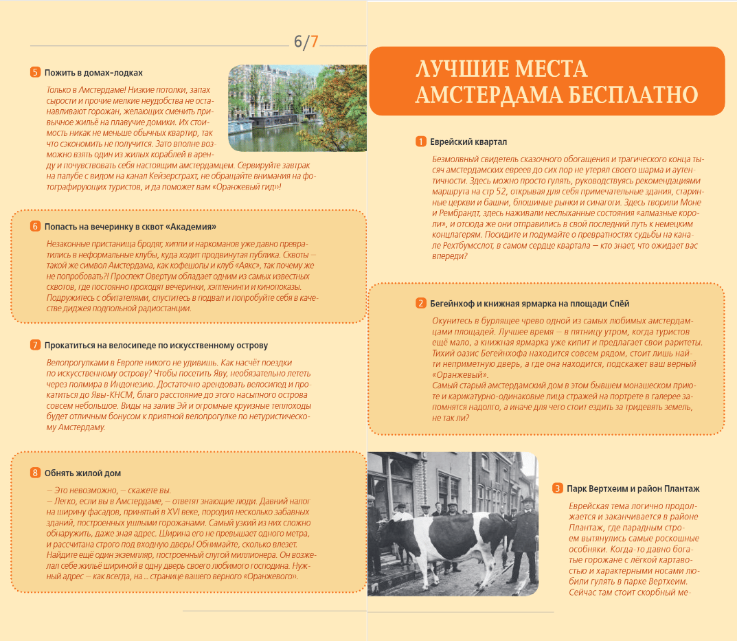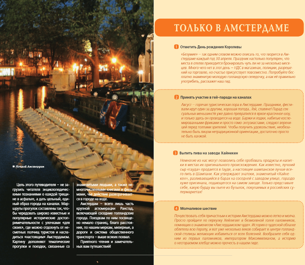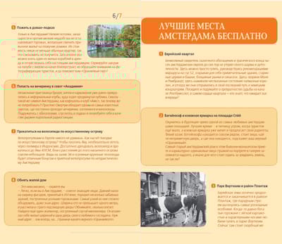 The bright orange guide to the freest city in the world can be yours! Interesting and many already favorite routes will open before you the doors of incredible Amsterdam. Our trails are laid out by Russian authors taking into account the interests and preferences of Russians. In a walk through the museum quarter you will get acquainted with the works of crazy Van Gogh and genius Rembrandt. For "just a walk" you will be offered romantic strolls along marvelous embankments with gingerbread toy houses. The new edition of the book contains new unique tips: what you can do absolutely free, what to do in the city in the rain and others. And of course, with the orange guidebook you will discover the most scandalous, attractive and piquant sides of the Dutch capital - if you want, you will have fun smoking in the famous coffee shops, look at the beauties in the Red Light District and even take part in the gay parade. How far can your curiosity take you? The Orange Guide goes everywhere with you!