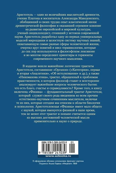 Aristotle is one of the greatest thinkers of antiquity, a pupil of Plato and tutor of Alexander the Great, who summarized in his works the experience of the classical era of ancient Greek philosophy and had a great influence on the development of European and world culture, a scientist-encyclopedist who stood at the origins of modern science. Aristotle developed one of the first universal models of the universe and a complete system of scientific knowledge covering the most diverse spheres of human life, outlined the range of concepts and introduced terminology that are still used in the philosophical lexicon and largely determine the guidelines and horizons of modern scientific thinking. The edition includes Aristotle's most important logical treatises that made up the "Organon" ("Categories", the first and second "Analytics", "On Interpretation", etc.), as well as "Nicomachean Ethics", a treatise addressing the problems of morality, in which the philosopher poses and comprehensively analyzes the most important questions of human existence: what is good, happiness and justice? In addition, the book includes "Physics" - Aristotle's fundamental treatise, which serves as a kind of introduction to all other natural-scientific works of the thinker, including those that today we refer to the field of biology and psychology. Aristotle's Physics has little in common with the science that is called physics today, yet this treatise is still considered one of the highest achievements of human thought as applied to the science of nature.