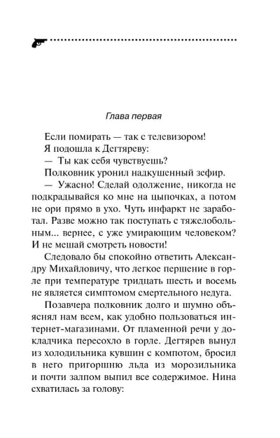If I'm going to die, I'm going to die with a TV set! Colonel Degtyarev bravely endured a sore throat and a temperature of thirty-six and eight, lying in bed and clicking the remote control. But he didn't have a chance to be properly ill. The office of his agency "Tyuh" was approached by a rich businessman Philip Marin. He said that his wife Flora had drowned a month and a half ago. Philippe is mad with grief, and recently in a restaurant saw his half-sister Anna with his favorite bag Flora. But this bag, made to order, exists in a single copy ... How could it be at Anna's place? Philippe asks the detectives to talk to his sister and find out how she got it. Especially since all the other jewelry of the deceased in place ... What if it has something to do with Flora's death? Dasha Vasilyeva and Alexander Degtyarev take up the job and find out that all the participants of the drama are not who they say they are. And, moreover - they are not even who they think they are. How can you not go crazy?!