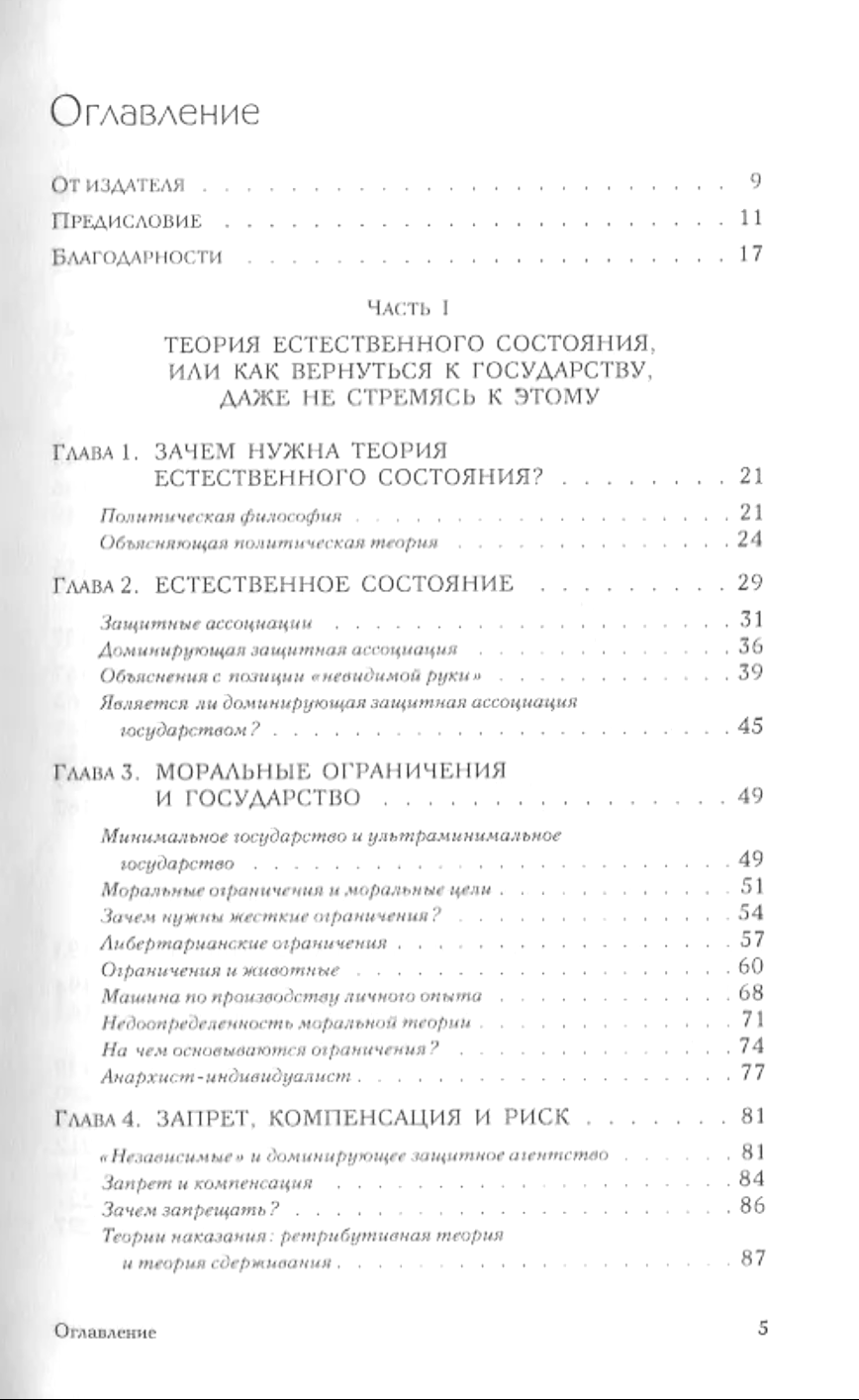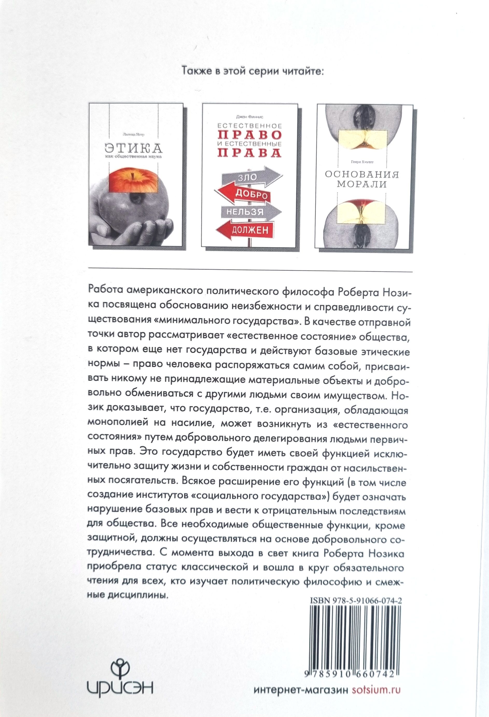 The work of the American political philosopher Robert Nozick is devoted to the justification of the inevitability and fairness of the existence of a "minimal state". As a starting point, the author considers the "natural state" of society, in which there is no state yet and basic ethical norms are in effect - the right of a person to dispose of himself, to appropriate material objects that do not belong to anyone, and to voluntarily exchange his property with other people. Nozick proves that the state, i.e. an organization with a monopoly on violence, can arise from the "natural state" through the voluntary delegation of primary rights by people. This state will have as its function exclusively the protection of the life and property of citizens from violent encroachment. Any expansion of its functions (including the creation of institutions of the "welfare state") will mean a violation of basic rights and lead to negative consequences for society. All necessary social functions, except for the protective one, must be carried out on the basis of voluntary cooperation. Since its publication, Robert Nozick's book has acquired the status of a classic and has become mandatory reading for all who study political philosophy and related disciplines. It will be useful for specialists in the field of political philosophy, political science, economics, law, sociology, as well as students and teachers of relevant specialties.