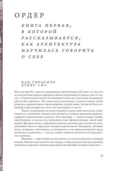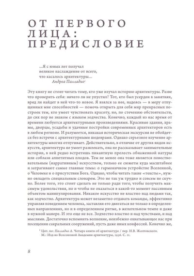 The seven chapters, which the author called "books" in accordance with the long-standing tradition of architectural treatises, tell about the main design solutions, about how the creative will of the architect is directed not only at walls and ceilings, but also at the spaces between them, about how ideas about the structure of the external world and the labyrinths of internal worlds are reflected in architecture.