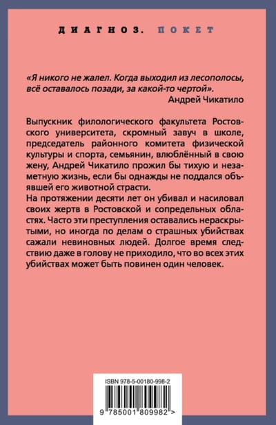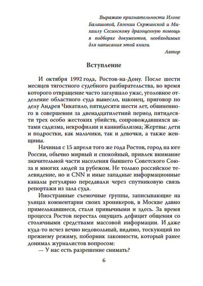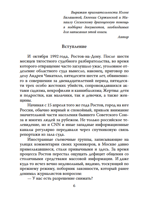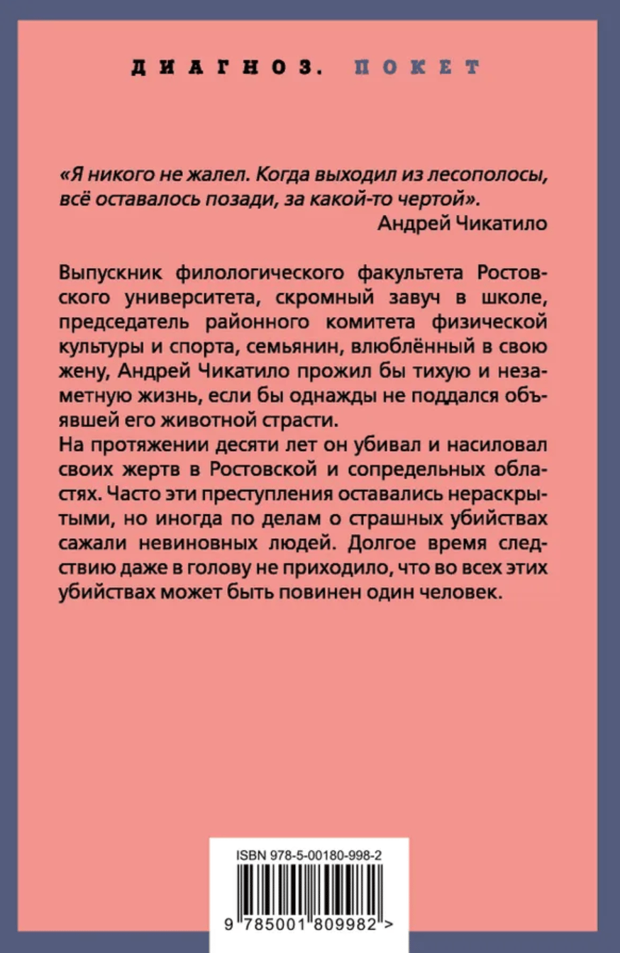 A graduate of Rostov University's Philology Department with a degree in Russian Language and Literature, a modest school vice principal, chairman of the district committee for physical education and sports, a humble family man, and deeply and forever in love with his wife, Andrei Chikatilo would have lived a quiet and unremarkable life had he not one day succumbed to the passion that overwhelmed him.