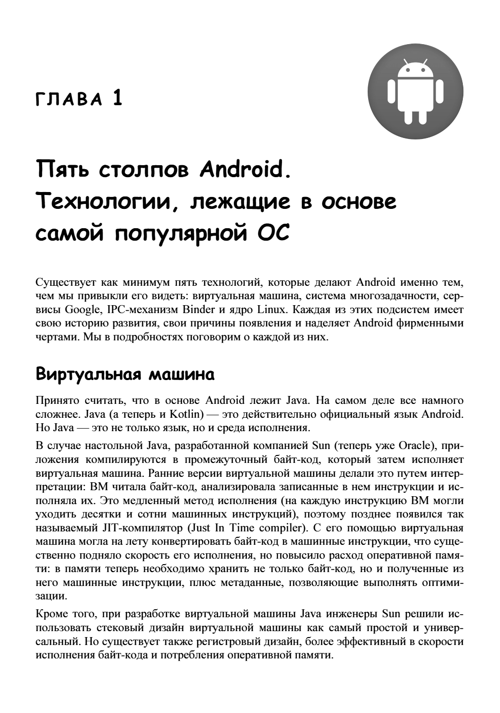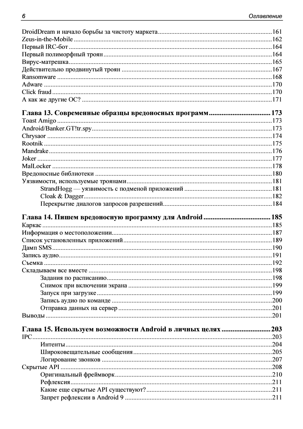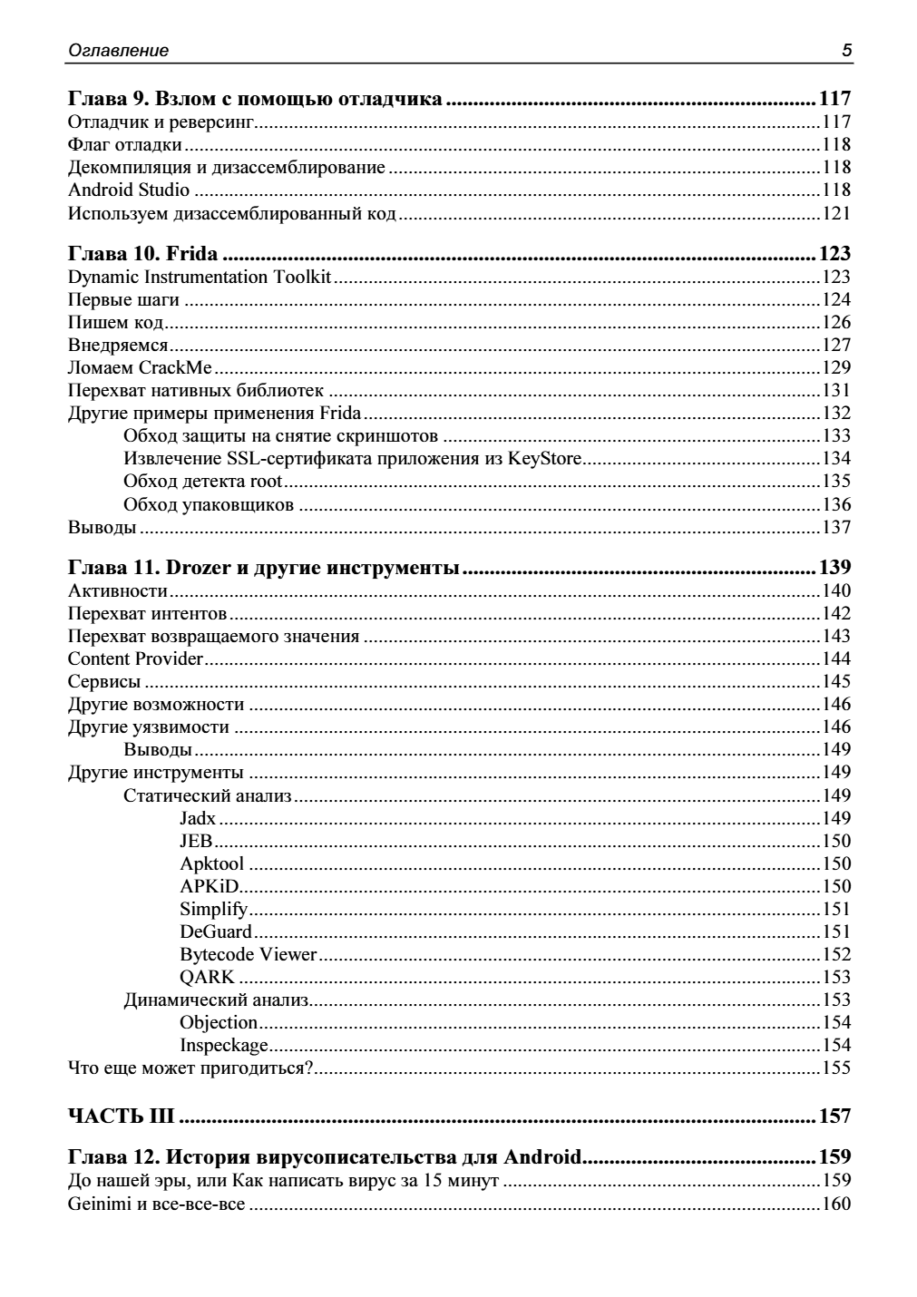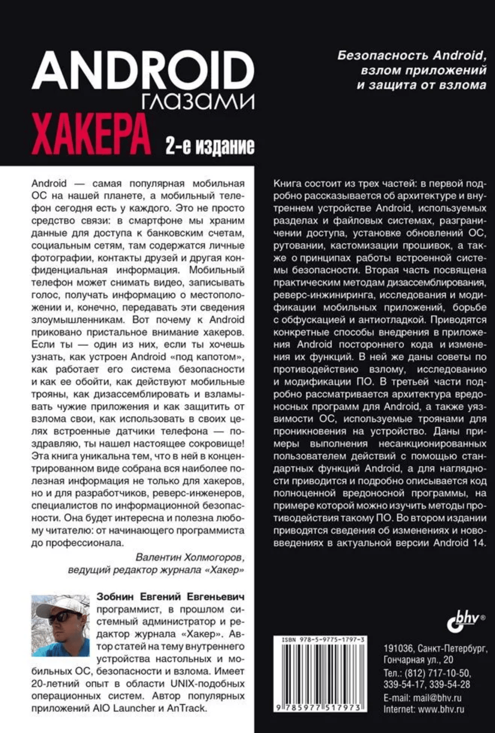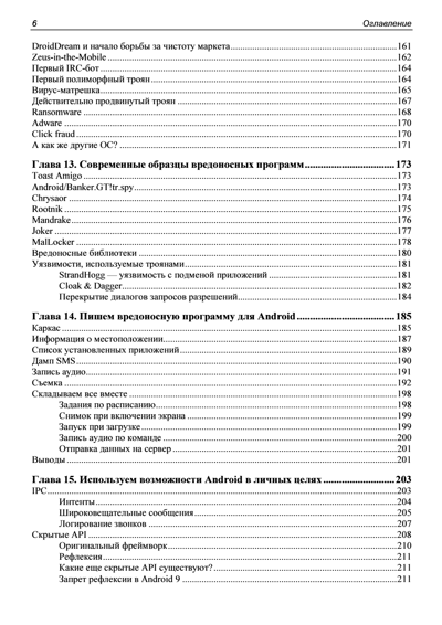 The internal architecture of Android OS, the partitions and file systems it uses, the principle of operation of update mechanisms and internal security tools are considered. The author describes access differentiation in Android OS, privileges, methods of obtaining root rights, customization and installation of non-standard firmware. Tools for disassembling, debugging and analyzing mobile application code are described, examples of code modification to change software functions and introduce third-party modules into the application are given. Detailed recommendations on how to deobfuscate code and bypass anti-debugging are given, as well as practical advice on how to protect your own applications from decompilation and research. Information about malicious programs for the Android platform, the vulnerabilities they use, and code samples of such programs are given. The author describes how to use standard Android functions for non-standard purposes and how to counteract malware.