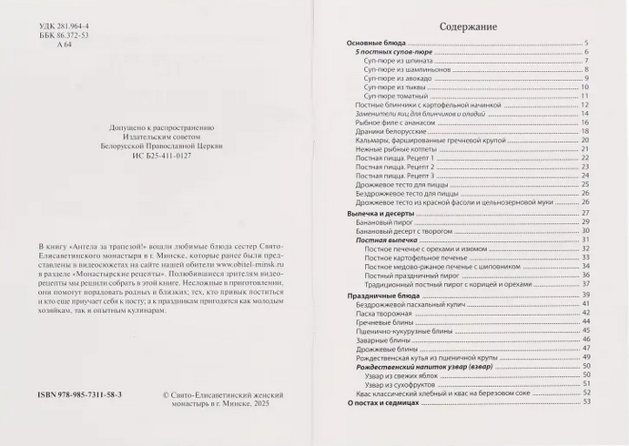 The small collection includes the favorite dishes of the monastery sisters, which are presented in videos on our website in the "Monastery Recipes" section. The sisters of the monastery, who came from different countries, share their experience and favorite recipes. Among them are both Lenten dishes and those that are suitable for any day. All of them are prepared with prayer, warmth and love and carry a piece of Divine love. Now the video recipes that viewers love are collected on 50 pages of the book. Easy-to-prepare dishes will help please family and friends: those who are used to fasting and those who are still accustomed to fasting. And for the holidays, the recipes will be useful for both young housewives and experienced cooks. We hope that the experience of our sisters will inspire you and help fill your daily kitchen chores with spiritual meaning, and the recipes will diversify the family table. Now the video recipes that viewers love are collected on 50 pages of the book. Easy-to-prepare dishes will help please your family and friends: those who are used to fasting and those who are still accustomed to fasting. And for the holidays, the recipes will be useful for both young housewives and experienced cooks.