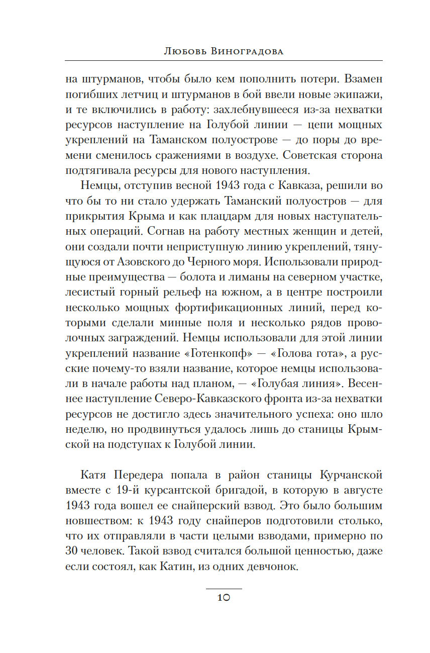 The sniper movement in the Red Army began in the most desperate days of the war, in the autumn of 1941 on the Leningrad Front. In 1943, the first female sniper platoons appeared in the active army. Many of these "angels of vengeance" had dozens of killed enemies to their credit. Not all of these girls lived to see the end of the war. Those who were lucky returned, still very young, to the life of ordinary Soviet women. And yet, the main event of their lives was the Great Patriotic War. The author of the book, Lyubov Vinogradova, worked in archives, studied eyewitness memoirs, met with participants in the events and their family members. The result of this painstaking work was a unique historical and documentary study on the contribution of female snipers to the victory in the Great Patriotic War.