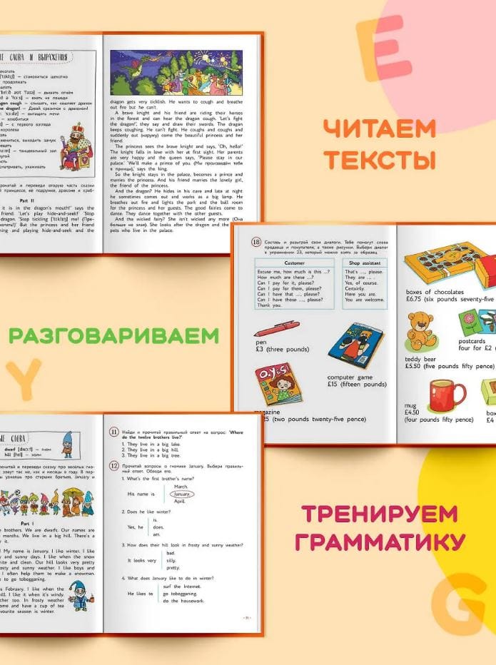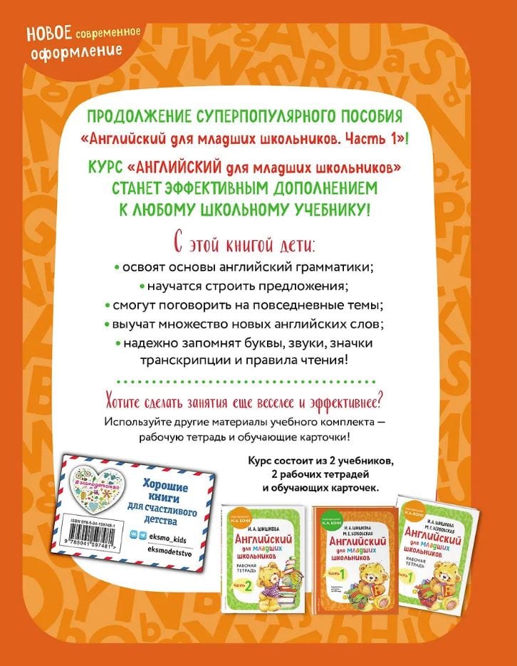 The first part of the course "English for Primary School Children" introduces children to the letters and sounds of the English language, and the second teaches them to confidently construct simple sentences, talk about themselves and their family, and understand simple grammatical constructions. Irina Shishkova's original method helps children easily master the English language, gradually moving from simple to complex. The audio recording is available via QR code. It will help children develop excellent pronunciation and teach them to understand English speech by ear. The book will be an invaluable addition to any textbook that your schoolchild uses. Each lesson is a small step towards greater success in English.