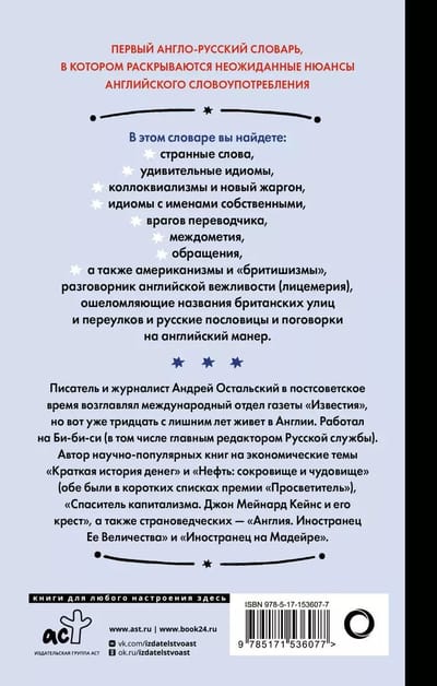 This book is the first English-Russian dictionary that reveals unexpected nuances of English word usage. In it you will find: strange words, amazing idioms, colloquialisms and new jargon, idioms with proper names, enemies of the translator, interjections, addresses, as well as Americanisms and "Britishisms", a phrasebook of English politeness (hypocrisy), stunning names of British streets and alleys and Russian proverbs and sayings in the English manner.