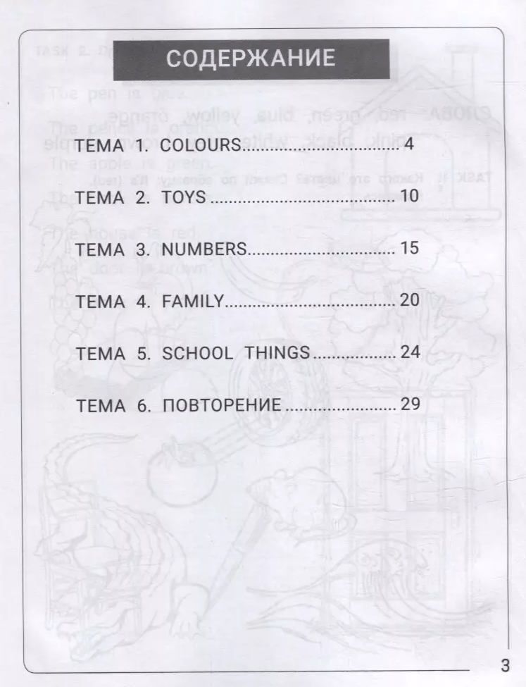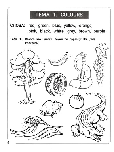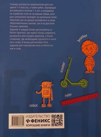 The coloring dictionary is aimed at students of 1-2 grades, as well as children studying English for 1-2 years, and is designed to work out words on the main topics that schoolchildren pass at the initial stage of learning both in English lessons in secondary schools and in additional classes. Designed for students who are familiar with English letters and learn to read and write, will help to consolidate in a playful form the words passed in lessons. To better work out the vocabulary, it is recommended to check each task out loud with the teacher, read and pronounce the answers. Tasks in each topic range from simpler, where you just need to connect, color or name pictures, to more complex, where you need to read and write words. At the end is a block of tasks to repeat all the mentioned topics and words.
