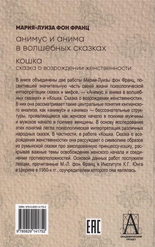 The book combines two works by Maria-Louise von Franz, who devoted a significant part of her life to the psychological interpretation of fairy tales and myths - Animus and anima in fairy tales and Cat. A tale of the rebirth of femininity.”