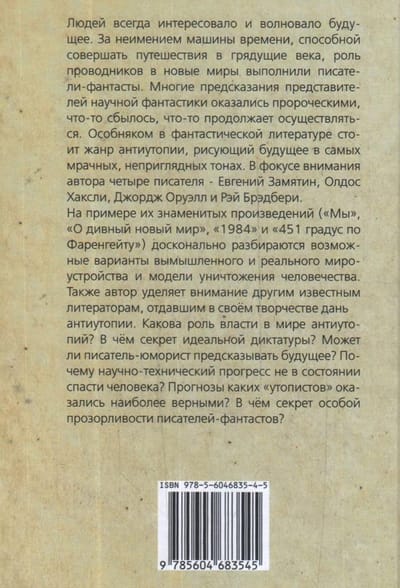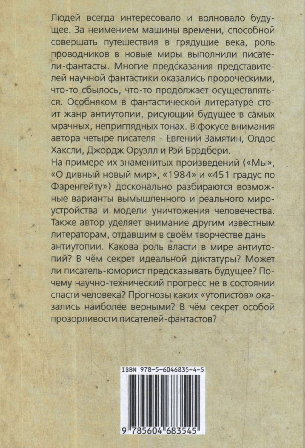People have always been interested in and concerned about the future. In the absence of a time machine capable of traveling to the coming centuries, the role of guides to new worlds was performed by science fiction writers. Many predictions of representatives of science fiction turned out to be prophetic, something came true, something continues to be realized. Separate in fantastic literature is the genre of dystopia, drawing the future in the darkest, unsightly colors. The author focuses on four writers - Eugene Zamyatin, Aldous Huxley, George Orwell and Ray Bradbury. On the example of their famous works ("We", "Oh Wonderful New World", "1984" and "451 degrees Fahrenheit") possible variants of fictional and real world order and models of destruction of mankind are thoroughly analyzed. The author also pays attention to other famous writers who paid tribute to dystopia in their work. What is the role of power in the world of dystopias? What is the secret of an ideal dictatorship? Can a humor writer predict the future? Why is scientific and technological progress unable to save man? Which "utopians"' predictions turned out to be the most correct? What is the secret of the special foresight of science fiction writers?