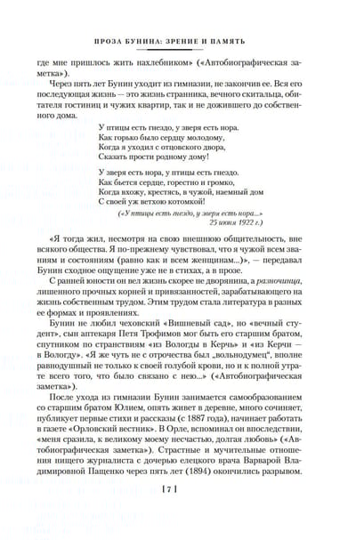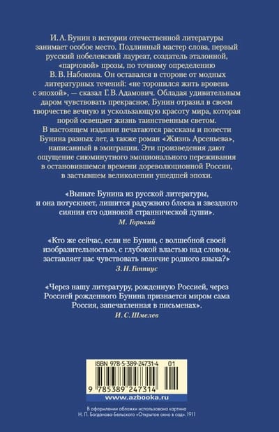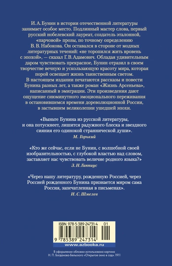 And. A. Bunin in the history of national literature occupies a special place. A true master of the word, the first Russian Nobel laureate, the creator of the standard, “brocade” prose, by the exact definition of V.V. Nabokov. He remained aloof from the fashionable literary currents: “he was not in a hurry to live on a level with the era,” said G. Adamovich. Possessing an amazing gift to feel beautiful, Bunin reflected in his work the eternal and elusive beauty of the world, which sometimes illuminates life with a mysterious light. This publication publishes stories and novels of Bunin of different years, as well as the novel “Life of Arsenyev”, written in exile. These works give a sense of momentary emotional experience in the stopped time of pre-revolutionary Russia, in the frozen splendor of a bygone era.