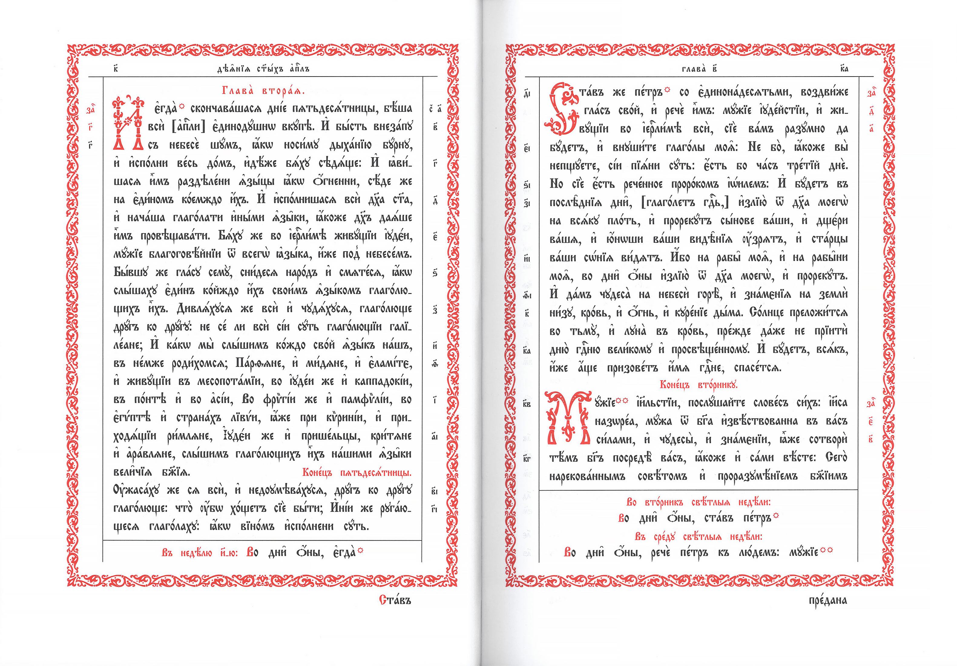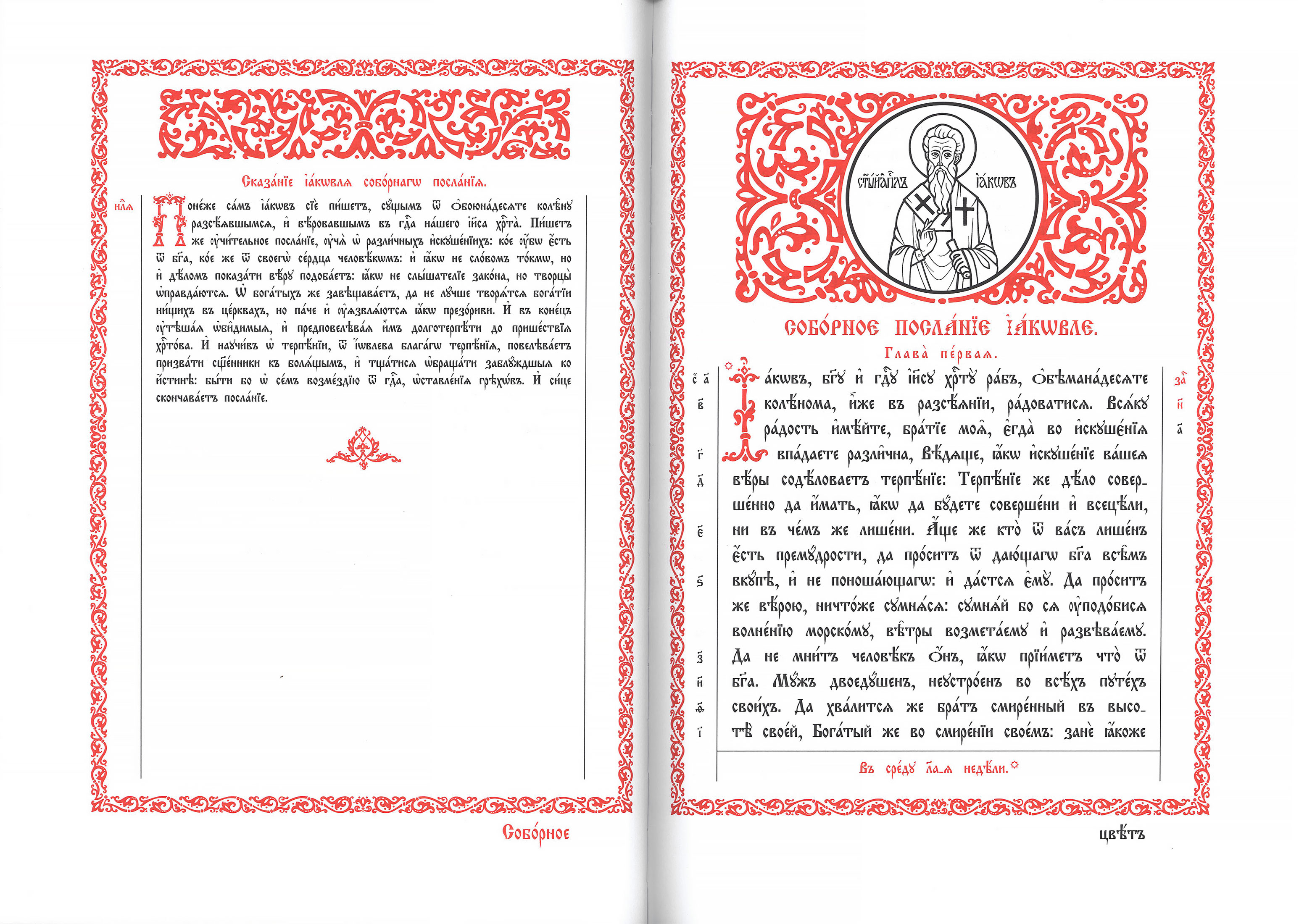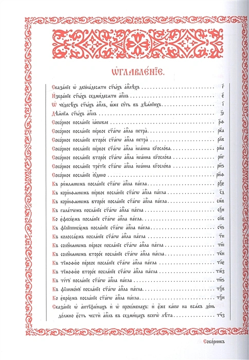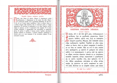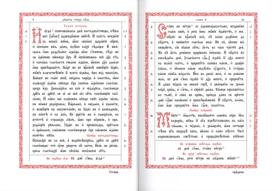 This Apostle, printed in Church Slavonic script, is distinguished by its ease of use during worship services. The main text of the Apostle is set in a large, easy-to-read font and is conveniently arranged within the pages. The large-printed prokeimena and alleluiaria easily stand out from the statutory instructions, which are printed in a smaller font. The book's composition corresponds to traditional editions of the Apostle. It includes the books of the New Testament Scripture—the Acts of the Apostles and the Apostolic Epistles. The book margins indicate the numbers of the liturgical chapters, and at the bottom of the page are introductory words for the worship service. In the section containing the prokeimena, the texts of the prokeimena and alleluiaria are presented in full, without abbreviations. The Apostle includes liturgical texts for the New Martyrs and Confessors of Russia. The section on prokeimna to common saints includes prokeimna, directions for apostolic readings, alleluiaria, and sacramental liturgies from common services to the New Martyrs and Confessors of Russia in the 20th century. The menologion includes the names of saints glorified in recent years, along with corresponding prokeimna and apostolic readings.