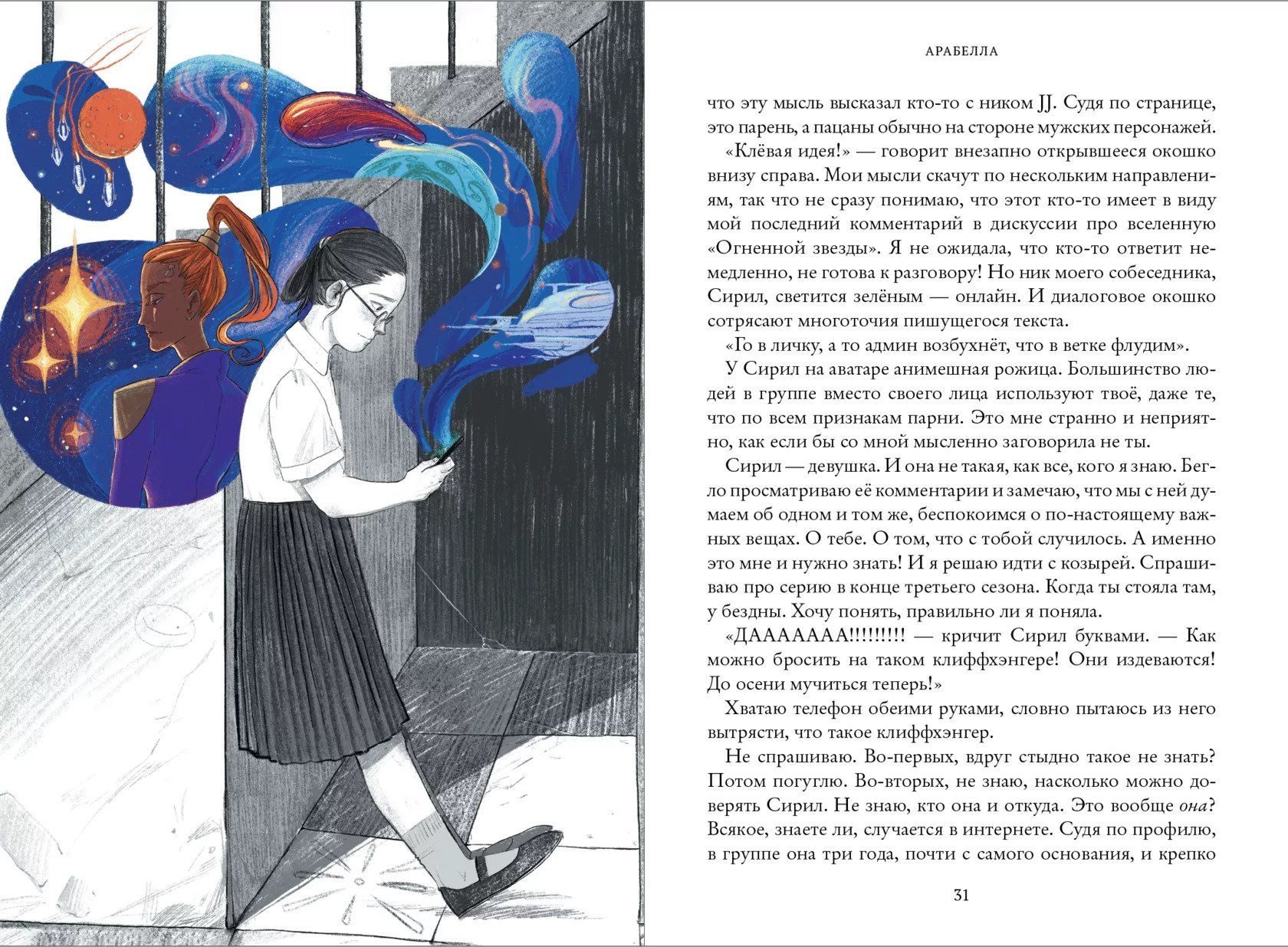 Sasha is fourteen, and she can't find a place for herself anywhere. At home, she has a perpetually agitated mother and older sister; at school, she has an unloved geometry class and cruel classmates. But Sasha has something she really likes - the science fiction series "Fire Star" - and she immerses herself in this world entirely. The main character of the show becomes her best, albeit imaginary, friend. Sashka takes the name Arabella and enters the circle of the same fans, where she finds new friends. Her infatuation gives Arabella a real superpower - faith in herself. But where is the line between reality and fiction? How to be, if the real world is becoming more and more unbearable, and escape into fantasy is so easy? Sashka-Arabella will have to find answers to these and many other questions...