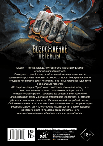 "From the outside the history of "Aria" may seem like a fairy tale..." - with such words the book about the most famous Russian "metal" band begins. Having traced all the main milestones of the "Aryan" history through the eyes of the legendary band members themselves, you will be able to see for yourself whether it is true or not. Their superbly detailed storytelling, murderously accurate characterizations and inexhaustible sense of humor will clearly demonstrate how and why Aria reached a peak that no one from the Russian heavy metal scene has ever climbed and is unlikely to climb.