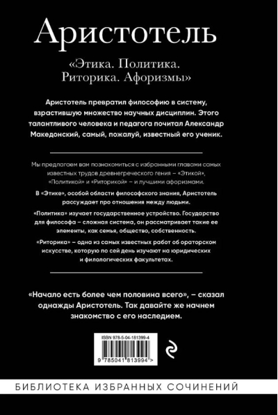 The importance of Aristotle for world philosophy is difficult to overestimate. The great scientist discovered the term "ethics", uniting with this word a set of rules of human behavior in society; he wrote about politics, the state, oratory... All this is united in our book of selected works of the great philosopher.
