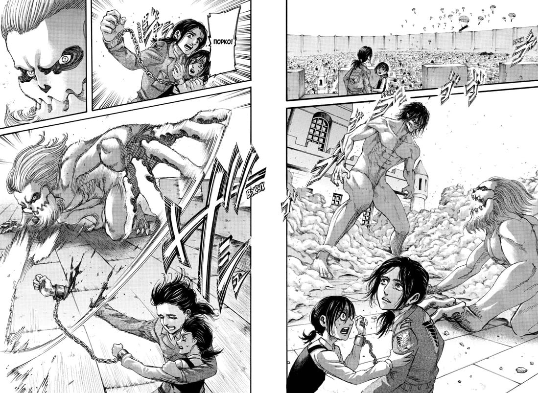 The supporters of Eren Yeager organize a military coup d'état to test a terrible weapon that crushes continents. The commander-in-chief is killed and the dissenters are arrested. Levi learns the true intentions of the Yeager brothers, but he has to pay too high a price for this knowledge. Meanwhile, Marley's army prepares to storm Sigansina....