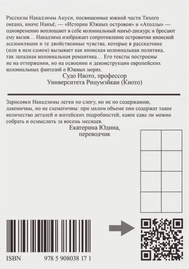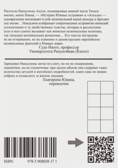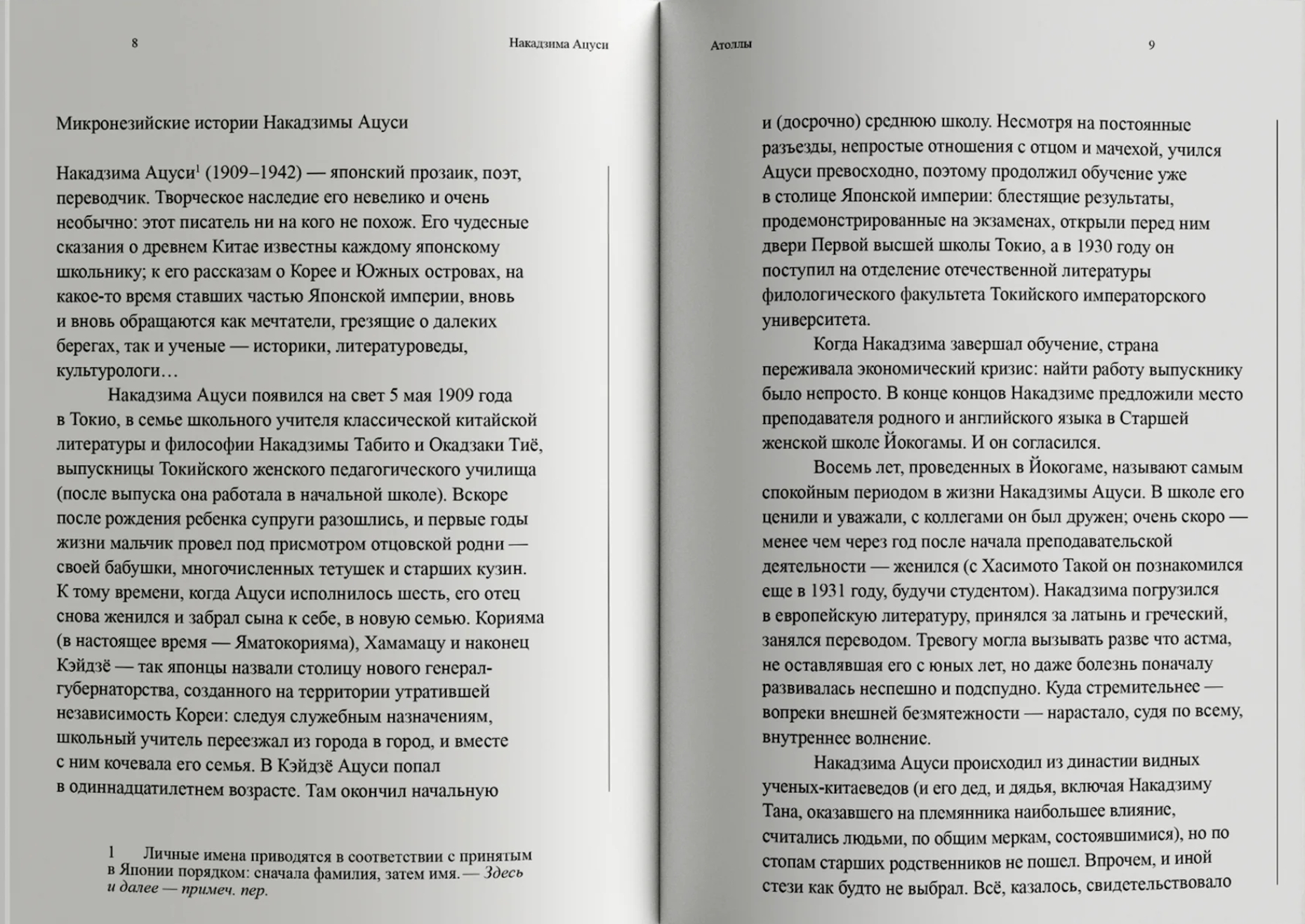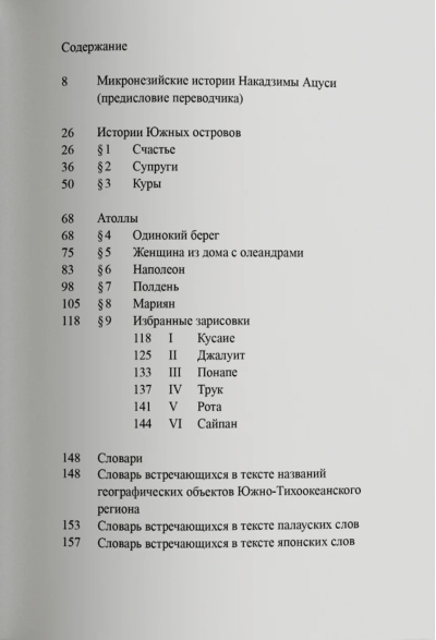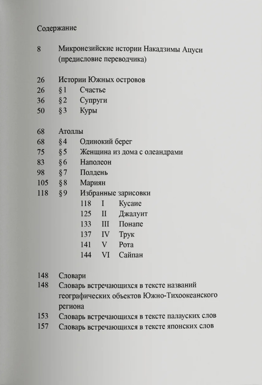 "Atolls" is a collection of short fiction by Japanese writer Nakajima Atsushi (1909–1942), whose work combines profound philosophical meditation with subtle poeticism. The publication includes two cycles of works: "Stories of the Southern Islands" and "Atolls," in which the author, drawing on his personal experience in Micronesia in 1941, builds fragile bridges between times and worldviews. Known for his reimaginings of Chinese legends, Nakajima here turns to colonial themes, exploring the clash of cultures and the nature of power. The first cycle, "Stories of the Southern Islands," includes parables and stories inspired by local myths and legends and intertwined with the everyday life of the islanders. The second, "Atolls," is a lyrical travel diary, where travel notes transform into philosophical essays. Nakajima's prose is concise and detailed, and his perspective—at once detached and penetrating—makes these texts unique testimonies of the era.