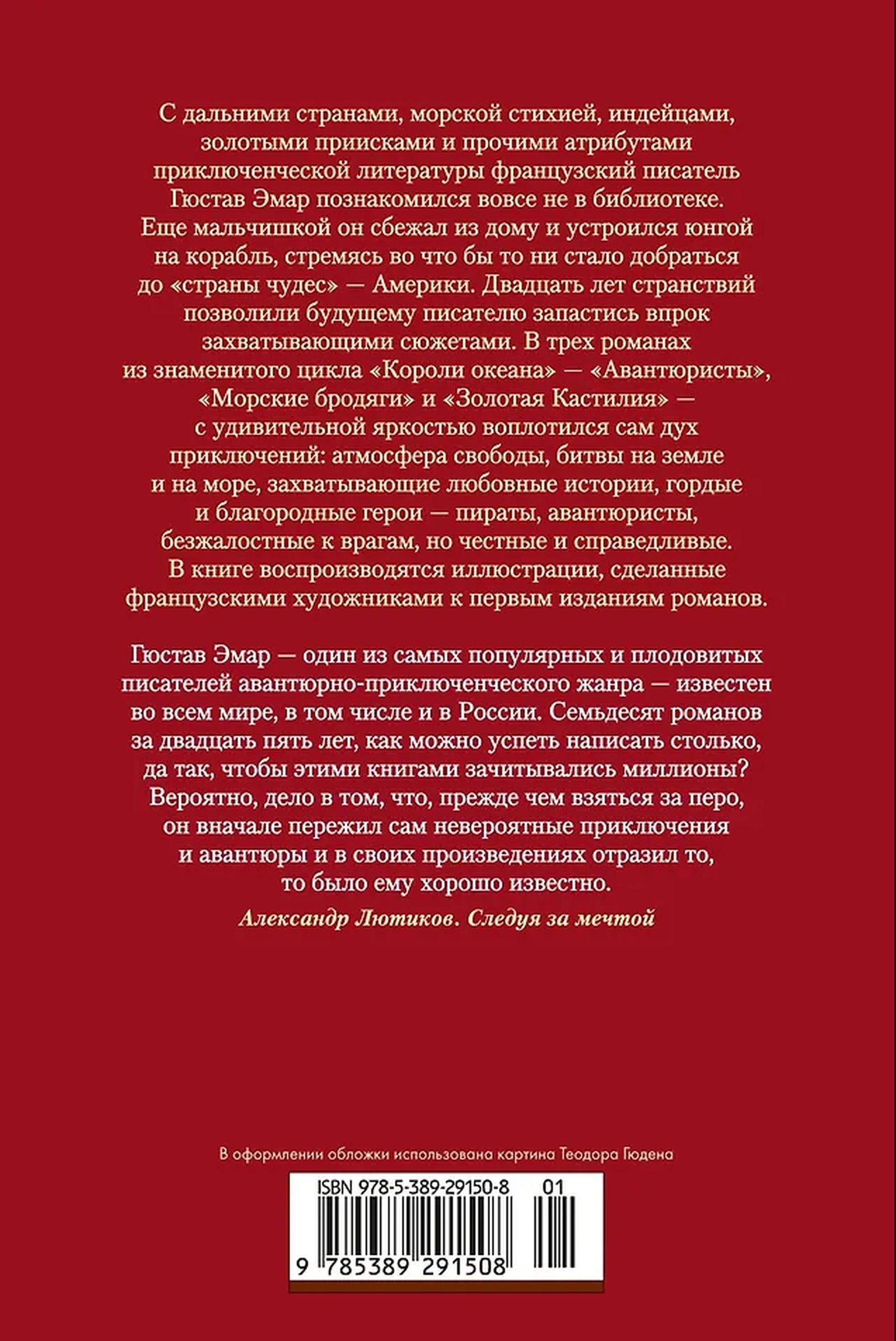 French writer Gustave Aimard didn't discover distant lands, the sea, Native Americans, gold mines, and other attributes of adventure literature in the library. As a boy, he ran away from home and found work as a cabin boy on a ship, determined to reach the "wonderland" of America. Twenty years of wandering allowed the future writer to stock up on captivating plots. Three novels from his famous "Kings of the Ocean" cycle—"The Adventurers," "The Sea Tramps," and "Castille d'Or"—captured the spirit of adventure with astonishing vividness: an atmosphere of freedom, battles on land and at sea, thrilling love stories, and proud and noble heroes—pirates and adventurers, merciless to their enemies yet honest and fair. The book reproduces illustrations by French artists for the first editions of the novels.