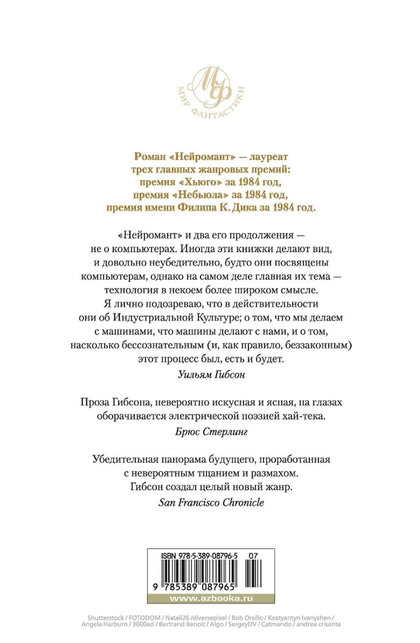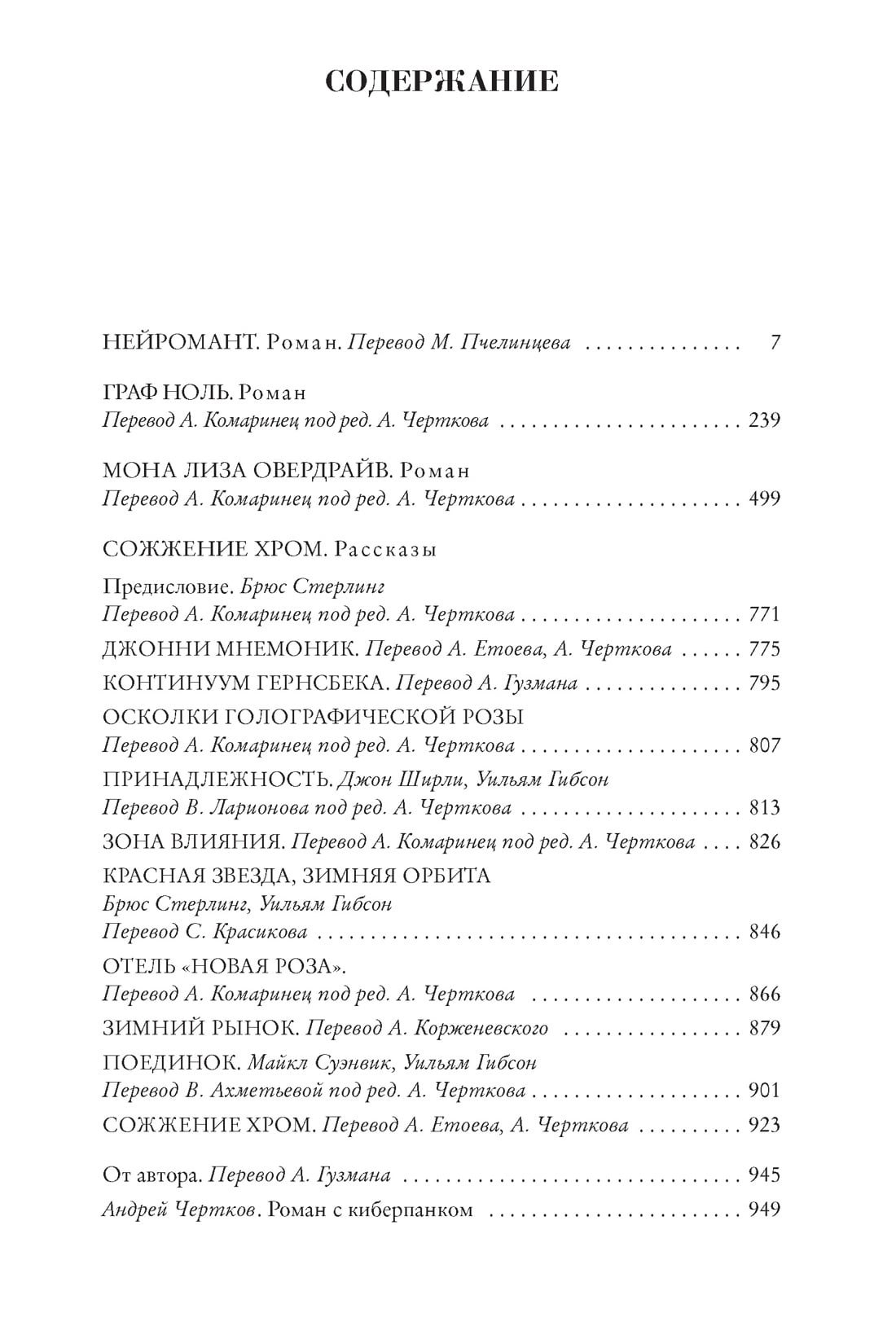 In addition to the trilogy itself, the book includes the "Burning Chrome" series of short stories, including "Johnny Mnemonic," which served as the basis for Robert Longo's cult film (starring Keanu Reeves, Takeshi Kitano, and Dolph Lundgren), and "New Rose Hotel," adapted for the screen by Abel Ferrara (starring Willem Dafoe, Christopher Walken, and Asia Argento).