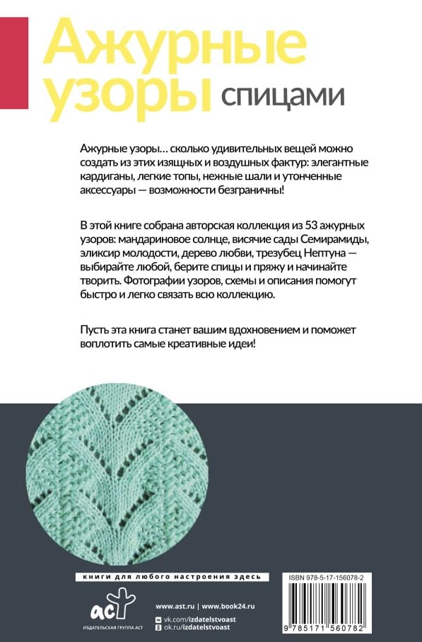 This book contains 53 openwork patterns: the tangerine sun, the hanging gardens of Semiramis, the elixir of youth, the tree of love, the trident of Neptune – choose any one, take spokes and yarn and start creating. Photographs of patterns, diagrams and descriptions will help to quickly and easily link the entire collection.
