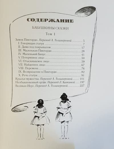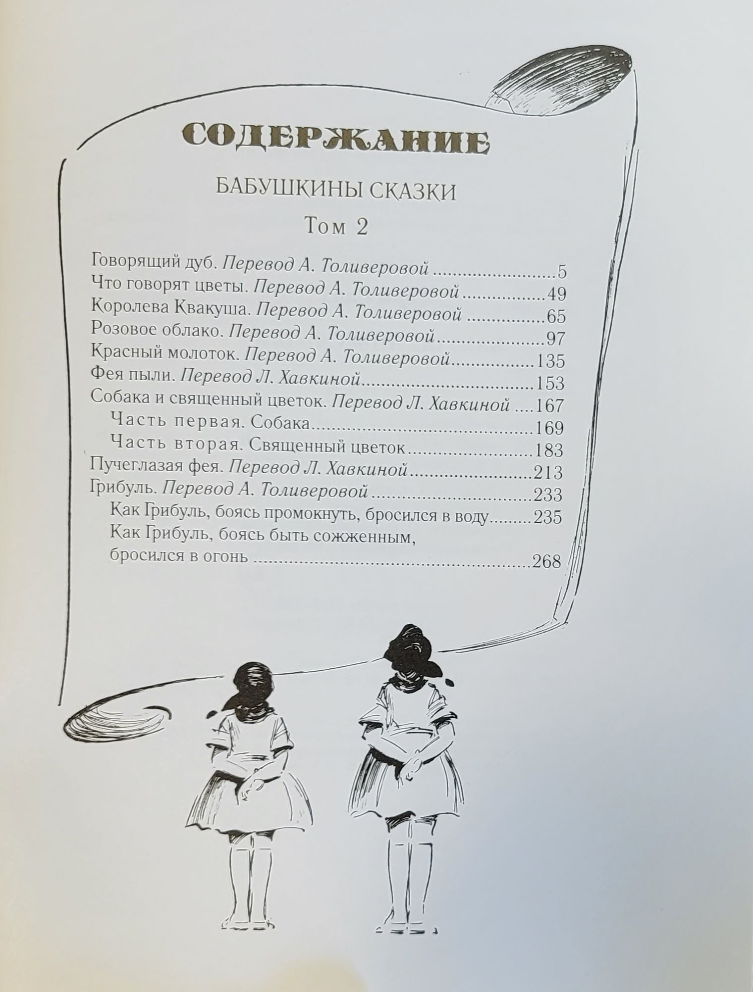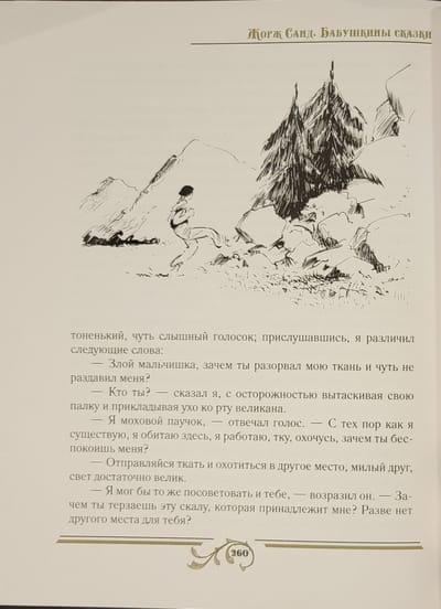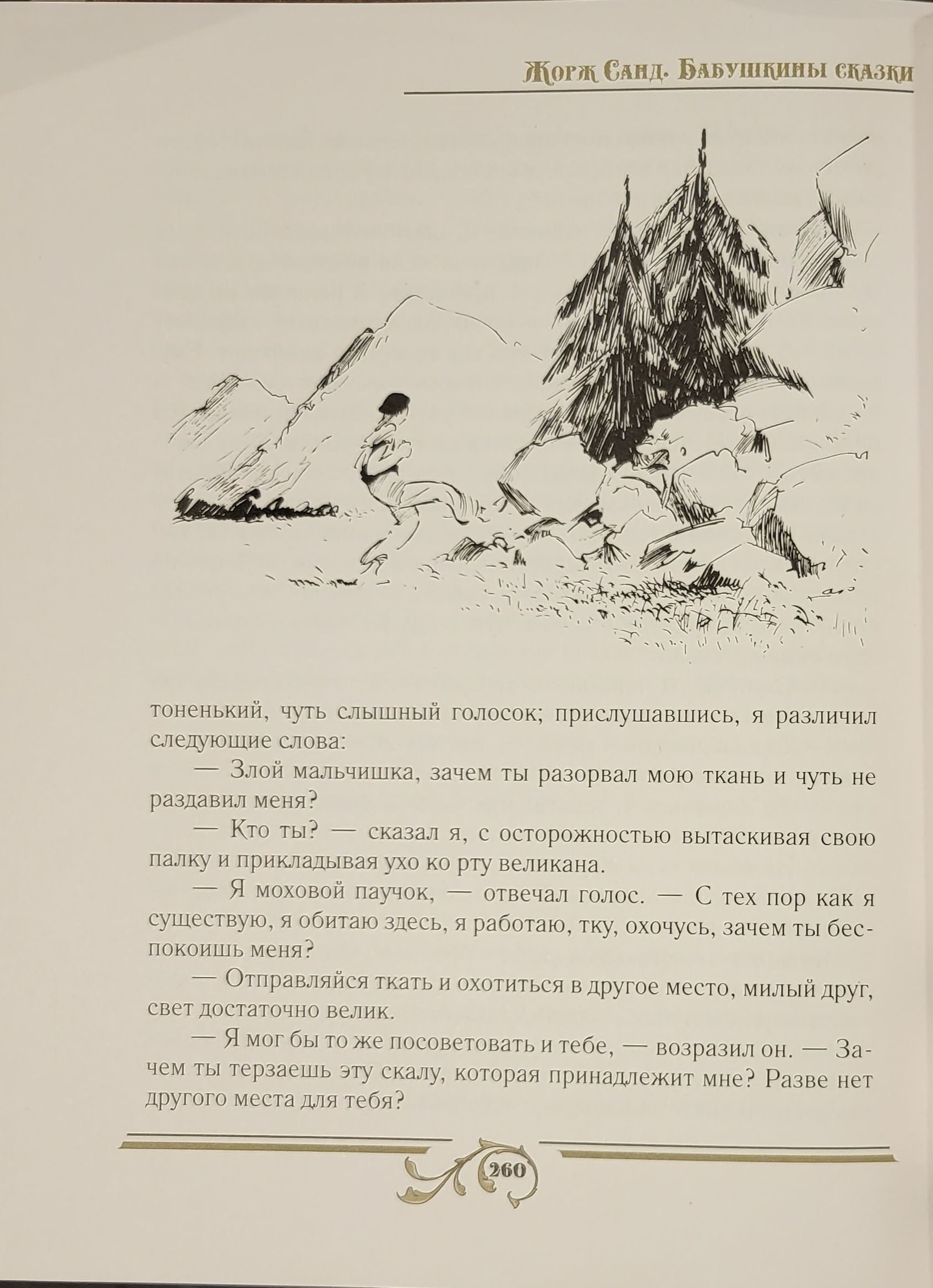 Georges Sand is the pseudonym of the French writer Aurora Dupin (1804-1876), under which she entered the history of classic literature for adult readers. However, she has wonderful works addressed to young readers as well - fairy tales that she composed for her beloved granddaughters Aurora and Gabriela, which became known as "Grandmother's Tales". "I suppose there are miracles in nature, otherwise I couldn't tell you about them," she wrote, prefacing one of her next stories. - It remains to be seen where the beings called supernatural are..." On the pages of these stories readers will have to find out where these creatures live, to get in touch with everything that should be in fairy tales: with good and evil, fairies and spirits, miracles and transformations. But these tales are designed not only to entertain, they teach, develop entering into a large and unknowable world of the little man, making him think about the origin of many phenomena, bringing up in him kindness, morality, unselfishness, love for people. And the philosophical bias and unusual plots of fairy tales make them interesting for adults. The first volume of the collection includes fairy tales: "The Castle of Pictordyu", "The Wings of Courage", "The Extraordinary Organ" and "The Giant Ieus", illustrated by French and Russian artists. The second volume of the collection includes fairy tales: "The Talking Oak", "What Flowers Say", "Queen Kwakusha", "The Pink Cloud", "The Red Hammer", "The Dust Fairy", "The Dog and the Sacred Flower", "The Knuckle-eyed Fairy", "Gribul", illustrated by French and Russian artists.