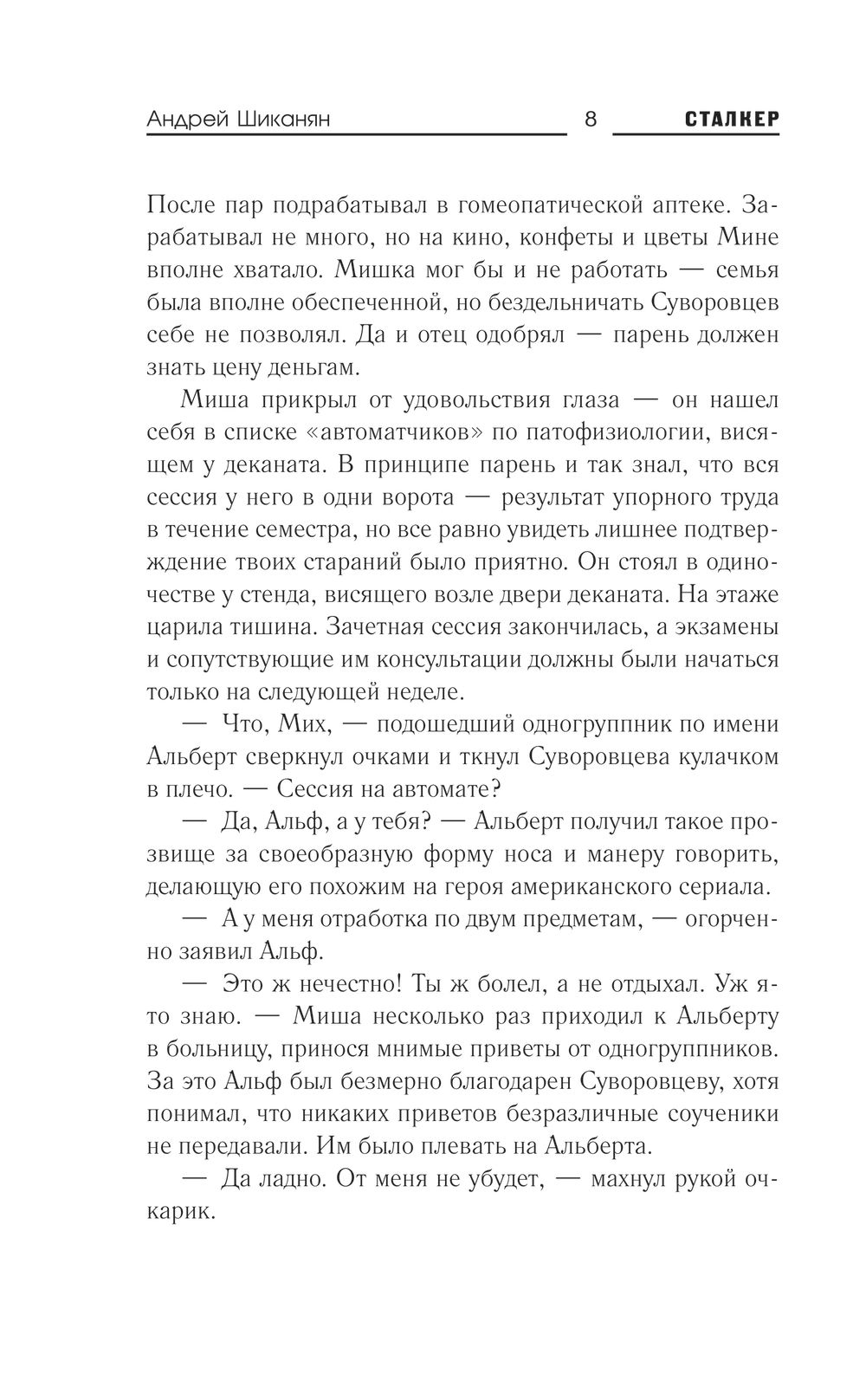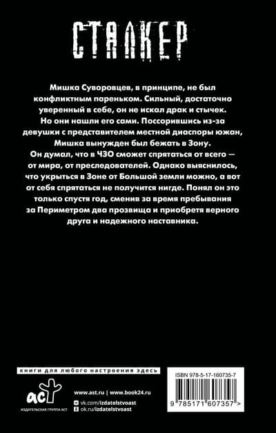 Mishka Suvorovtsev, in principle, was not a conflict boy. Strong, confident enough, he did not seek fights and skirmishes. But they found it themselves. Having quarreled over a girl with a representative of the local diaspora of southerners, Mishka was forced to flee to the Zone. He thought he would be able to hide from the world, from the persecutors. However, it turned out that you can hide in the Zone from the Big Land, but you can not hide from yourself anywhere. He realized this only a year later, changing during his stay behind the Perimeter two nicknames and gaining a loyal friend and reliable mentor.