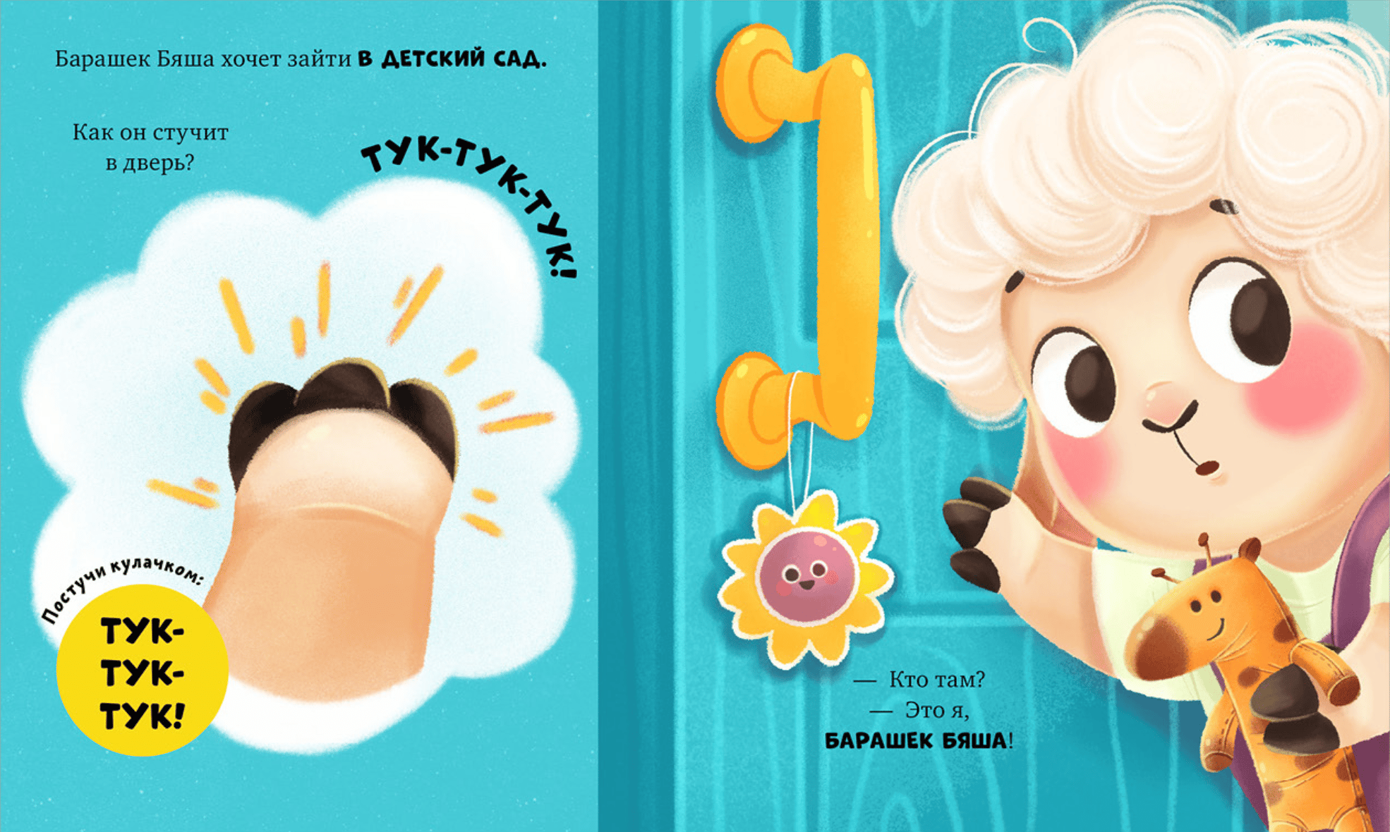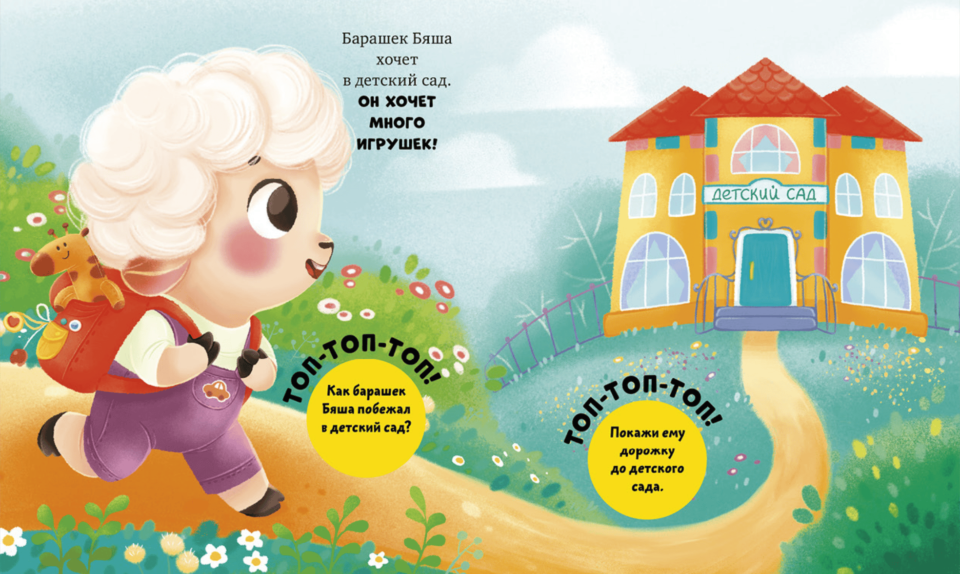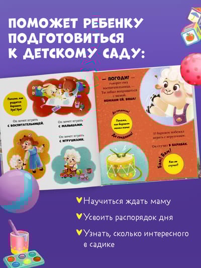 By playing with this book and observing Byasha, your child will learn about everything that awaits them at kindergarten. Together with Byasha, your little one will learn to wait for mom, grasp the daily routine, and discover the fun things to do at kindergarten. To help the sheep, your child will need to complete simple developmental tasks: clap your hands, pet the sheep, stamp your feet, and wave goodbye.
