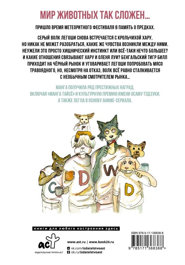 The animal world is so complex... It's time for the Meteor Festival to commemorate the ancestors. The gray wolf Legoshi meets Haru the rabbit again, but he can't figure out what the feelings between them are. Is it just a predatory instinct or is it something more? And what is the relationship between Haru and Louis the deer? Bengal tiger Bill comes to the black market and persuades Legoshi to try herbivore meat, but despite his refusal, the wolf is still confronted by an unusual market keeper.... The manga won a number of prestigious awards, including the Manga Taisho and the Osamu Tezuka Cultural Award, and was the basis for an anime series.