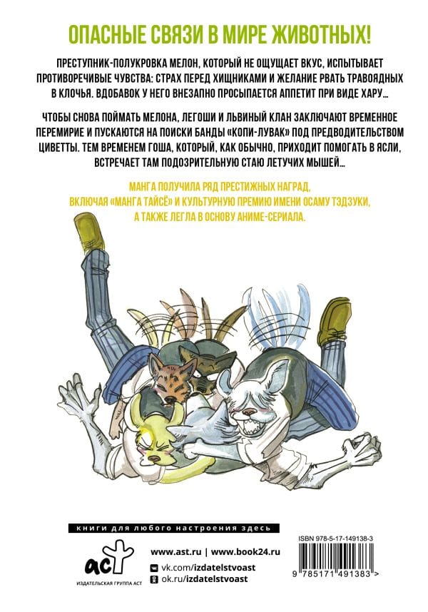 Dangerous connections in the animal world! Melon, a half-breed criminal with no sense of taste, has conflicting feelings: fear of predators and the desire to tear herbivores to shreds. In addition, his appetite is suddenly whetted by the sight of Haru..... In order to catch Melon again, Legoshi and the Lion Clan make a temporary truce and go in search of the Kopi Luwak gang led by a civet. Meanwhile, Gosha, who comes to help at the nursery as usual, encounters a suspicious flock of bats there...