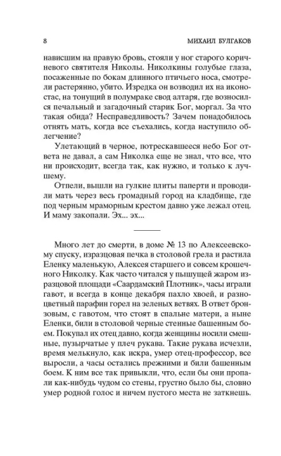 The novel "The White Guard" is the story of the "vague darkness" that fell upon his native land. It is the story of the Civil War, a terrible time of fratricidal conflict, a story of the collapse of traditions and foundations, a story of bloodshed, told through the eyes of an eyewitness and participant in the events. The writer began work on "The White Guard" in 1922, and by March 1923, the magazine "Rossiya" reported that Mikhail Bulgakov was completing the novel. "The White Guard" was Bulgakov's first major work, and the spirit with which Bulgakov entered Russian literature was reflected in all his subsequent work. This first "great prose" by Bulgakov already echoes the motifs of his final, "sunset novel," "The Master and Margarita."