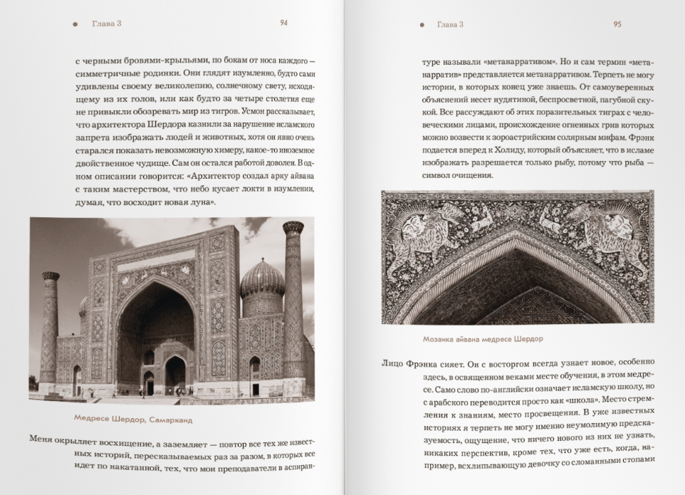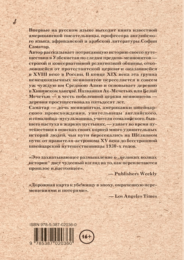 Many years later, a successful writer, professor of English, African and Arabic literature Sophia Samatar receives a book "The Great Migration of Russian Mennonites to Central Asia, 1880-1884" as a gift (Mennonitism emerged in the XVI century as a result of the reformation of the church in Europe; Mennonites were forced to emigrate, including to Russia), and she will discover an incredible story, about which she knew nothing. And so she embarks on a journey to Uzbekistan, through Tashkent, Samarkand, and Khiva, retracing the journey that her Mennonite ancestors made at the end of the nineteenth century. The story of the migration of these religious exiles to Central Asia, the way they sincerely believed that the Savior would come to the very settlement they were going to, the fact that the Muslim-Uzbeks gave them a small white mosque so that the Mennonite Christians would have a place to pray, and then the Mennonites themselves built their own temple, which the locals nicknamed "the white mosque" - all of this is as unusual as Sophia's own origins. Perhaps that's why she decided to take this adventure, traveling halfway around the world for it.