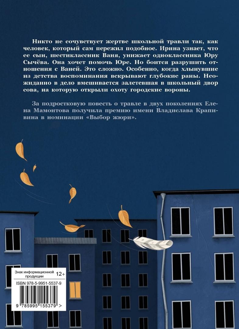 No one sympathizes with the victim of school bullying as a person who himself has experienced a similar experience. Irina learns that her son, sixth-grader Vanya, humiliates classmate Yura Sychev. She wants to help Yura. But she is afraid of destroying her relationship with Vanya. It's difficult. Especially when memories from childhood open deep wounds. Unexpectedly, an owl flies into the schoolyard and is hunted by the town's crows. The book is for children of middle school age. But it will be useful to read it and parents to solve children's problems together, and not throw everything on the school teachers.