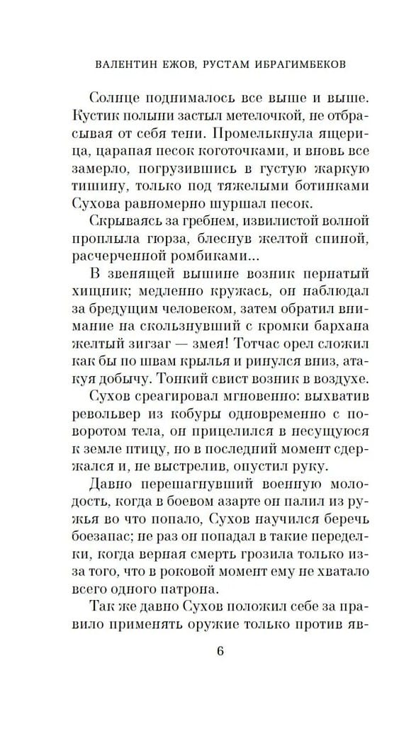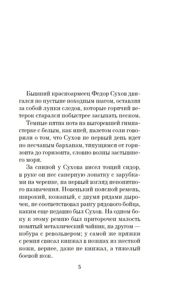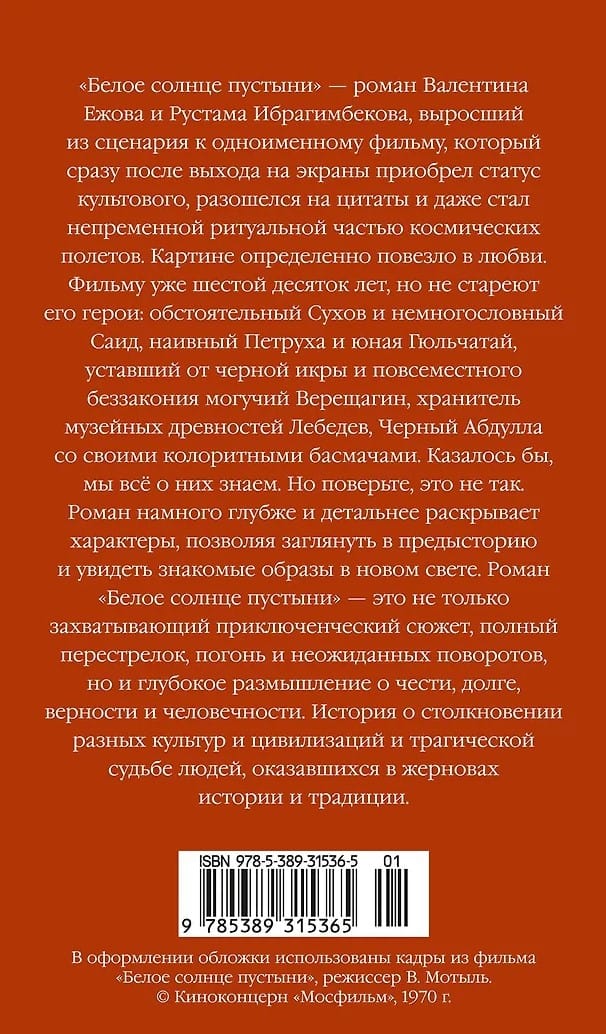 "White Sun of the Desert" is a novel by Valentin Yezhov and Rustam Ibragimbekov, based on the screenplay for the film of the same name, which immediately after its release acquired cult status, was widely quoted, and even became an essential ritual part of space flights. The film was certainly lucky in love. The film is already in its sixth decade, but its characters remain timeless: the thorough Sukhov and the laconic Said, the naive Petrukha and the young Gulchatay, the mighty Vereshchagin, tired of black caviar and ubiquitous lawlessness, the museum curator Lebedev, and Black Abdullah with his colorful Basmachi. It would seem we know everything about them. But believe me, we don't. The novel reveals the characters in much greater depth and detail, allowing us to peer into their backstory and see familiar images in a new light. The novel "White Sun of the Desert" is not only a gripping adventure full of shootouts, chases, and unexpected twists, but also a profound reflection on honor, duty, loyalty, and humanity. It's a story about the clash of different cultures and civilizations and the tragic fate of people caught in the millstones of history and tradition.