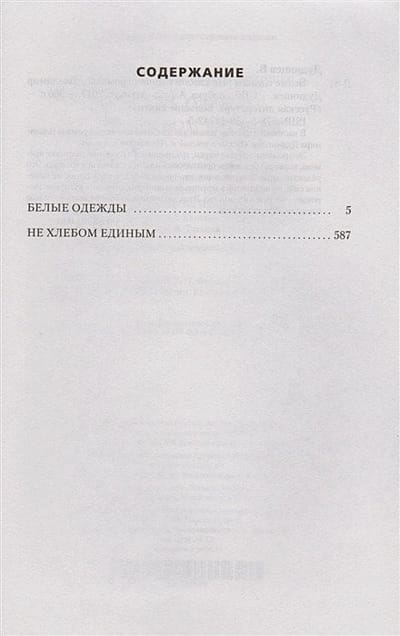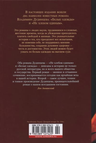 This edition includes two of the most famous novels by Vladimir Dudintsev: "White Clothes" and "Not by bread alone". These novels are novels about people of science, working in difficult, cruel times, when for beliefs had to pay freedom and life. These are fascinating stories about those who will overcome all the trials, not changing themselves, not giving in to the opinion of the majority, preserving spiritual health - honor and dignity. These people will be recognized by their white robes at the high court.