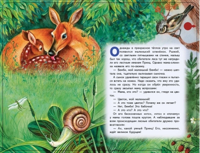 The musical book-audio-play "Bambi" will tell a wonderful story of a baby deer. About his first impressions, about the care of his mother, about the mysterious and sinister creature with three "hands" - about HIM. From the uncertain first steps to the graceful running of the leader "will pass" on the pages of the book Bambi. The text of the tale is adapted for children from 2 to 5 years old. The edition is made in a large format, decorated with colored foil. Each page is made of dense cardboard. 10 buttons, two modes of audio playback.