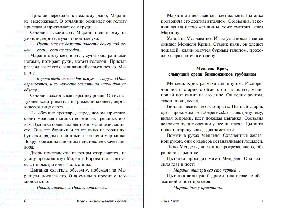 The noble Odessa bandit Benya Krik remains one of Isaac Babel's most famous literary characters to this day. Like all of Babel's prose, "Benya Krik" is imbued with the colloquial tone of Odessa: it allows the reader to immerse themselves not only in its visual but also in its acoustic imagery during the revolutionary period.