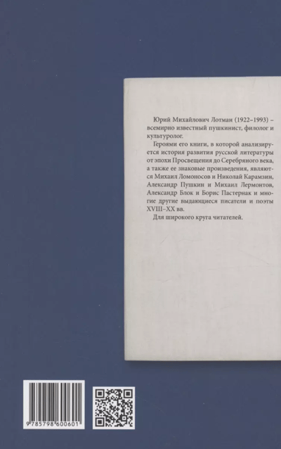 Yuri Mikhailovich Lotman (1922-1993) was a world-famous Pushkinist, philologist and culturologist. The heroes of his book, which analyzes the history of the development of Russian literature from the Enlightenment to the Silver Age, as well as its landmark works, are Mikhail Lomonosov and Nikolai Karamzin, Alexander Pushkin and Mikhail Lermontov, Alexander Blok and Boris Pasternak and many other outstanding writers and poets of the XVIII-XXX centuries. For a wide range of readers.