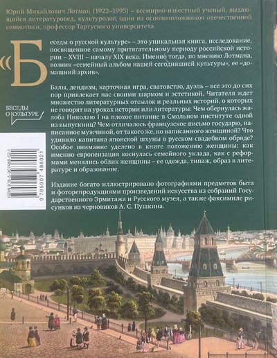 Yuri Mikhailovich Lotman (1922-1993) was a world-renowned scholar, a distinguished literary scholar, cultural studies expert, and one of the founders of Russian semiotics. He was a professor at the University of Tartu. "Conversations on Russian Culture" is a unique book, a study dedicated to the most captivating period of Russian history—the 18th and early 19th centuries. It was then, according to Lotman, that the "family album of our contemporary culture," its "home archive," emerged. Balls, dandyism, card games, matchmaking, and duels still captivate us with their charm and aesthetics.