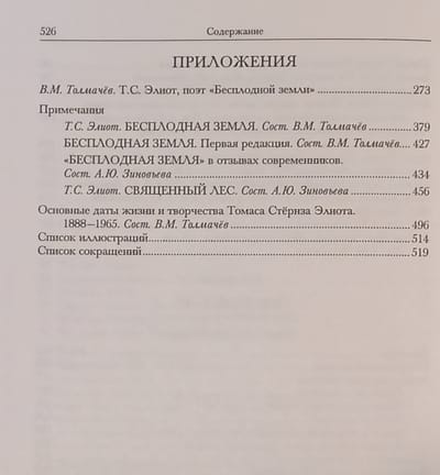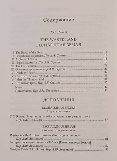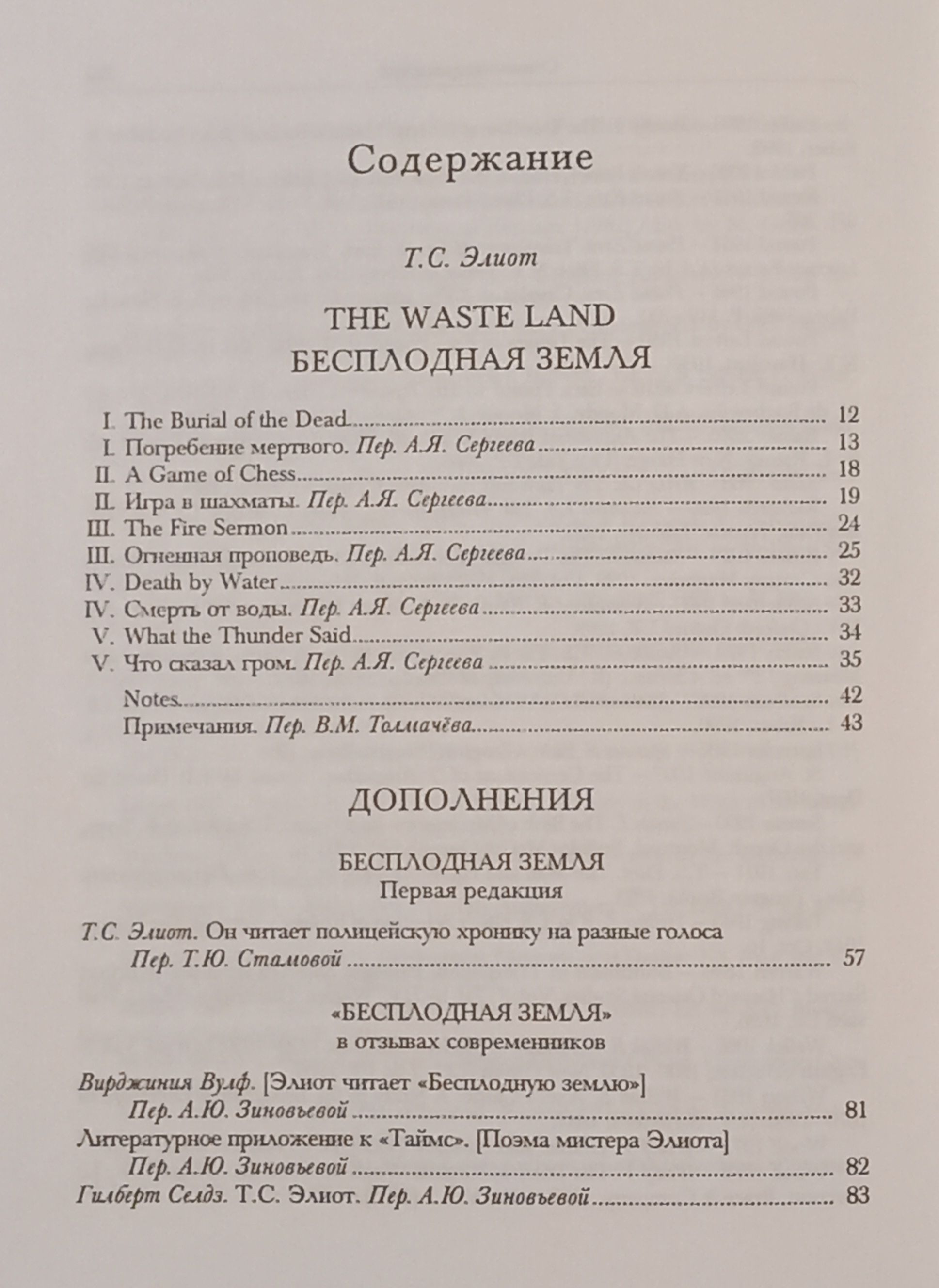The first Russian translation of The Wasteland was brilliantly executed by Andrei Yakovlevich Sergeev (1933-1998) and published in 1971. However, the poem, which survived many reprints and later translations, was never published in its entirety. In this edition it is published for the first time in Russian without distortion of the author's will, according to the first book edition of 1922. The parallel English text allows us to evaluate Eliot’s skill and the quality of A.Y. Sergeev’s translation. The publication is complemented by translations of the manuscript of the first edition of The Wasteland, reviews and critical responses to the poem – from W. Wolfe to K. Brooks, the founder of the American school of “new criticism”, as well as a full translation of Eliot’s book “The Sacred Forest: Essays on Poetry and Criticism” (1920), where he laid the principles of understanding his own creativity and modernist poetry in general. The translation of the first edition of The Wasteland presented in this volume is of particular value - this version of the poem differs significantly from its final version, revised by Eliot on the advice of Israel (Ezra) Pound.
