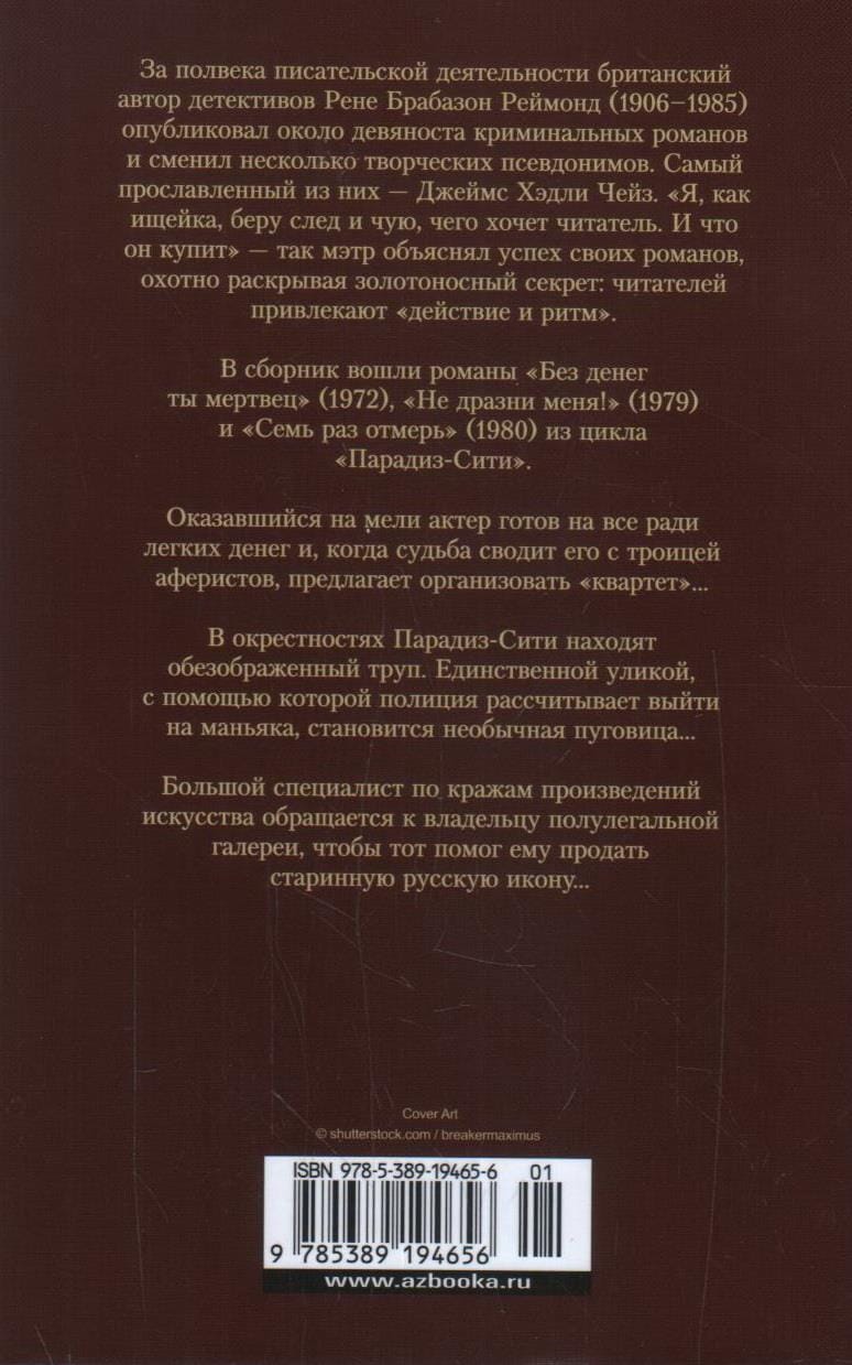 For half a century of writing, British detective author Rene Brabazon Raymond (1906-1985) published about ninety crime novels and changed several creative pseudonyms. The most celebrated of these is James Hadley Chase. "Like a bloodhound, I pick up the trail and smell what the reader wants. And what he will buy" - so the maestro explained the success of his novels, willingly revealing the gold-bearing secret: readers are attracted to "action and rhythm." The collection includes the novels "Without money you are dead" (1972), "Do not tease me!" (1979) and "Seven times measure" (1980) from the cycle "Paradise City". Finding himself broke actor is ready for anything for easy money, and when fate brings him together with a trio of swindlers, offers to organize a "quartet" ... In the vicinity of Paradise City find a disfigured corpse. The only evidence with which the police expect to get to the maniac, becomes an unusual button ... A big expert in art theft turns to the owner of a semi-legal gallery to help him sell an ancient Russian icon...