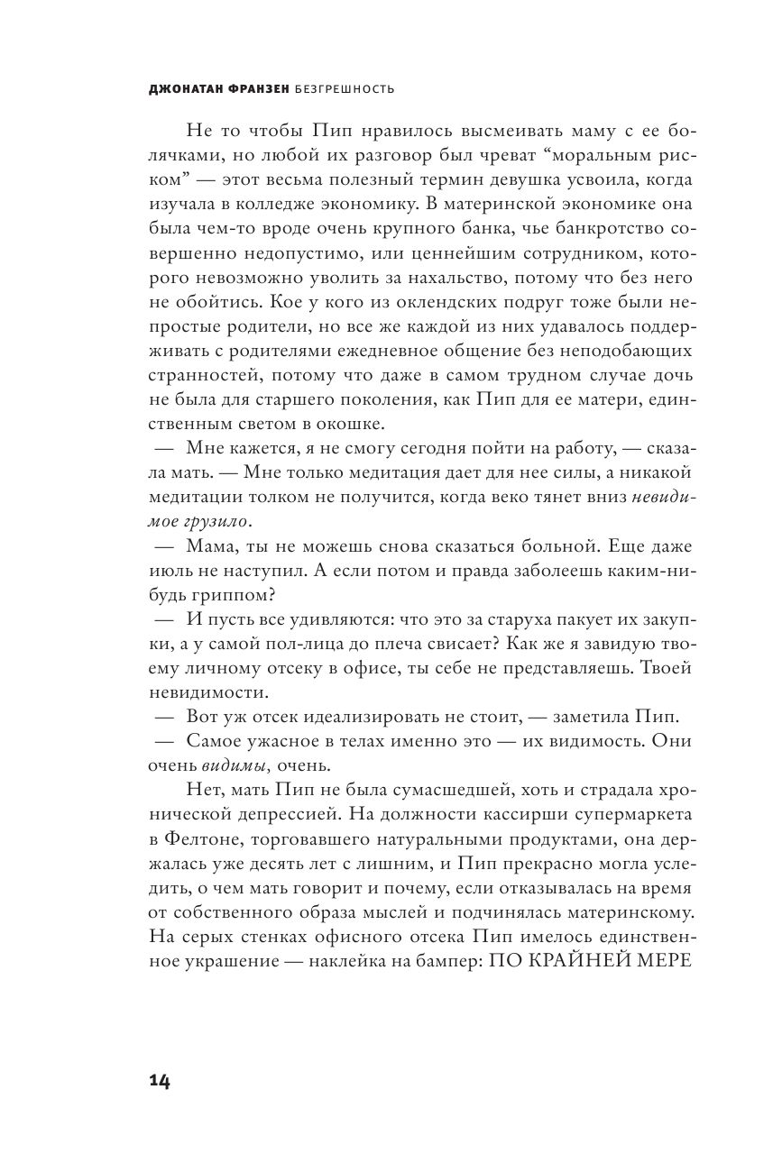 Twenty-three-year-old Pip hates her full name, doesn't know who her father is, can't pay off her school debt, and doesn't know how to build relationships with men. She has grown up with an eccentric mother who idolizes her only daughter and flatly refuses to talk to her about her past. Pip has no idea how many destinies she ties together and how strong her ability to distinguish good from bad makes her. Following the heroine in her courageous search for herself, Jonathan Franzen tackles the most important issues facing modern society: the totalitarian nature of the Internet, weapons of mass destruction, and the legacy of socialism in Eastern Europe. However, despite its unwavering monumentality and fidelity to the classical tradition, Sinlessness has been recognized by critics as Franzen's most personal and subtle novel.