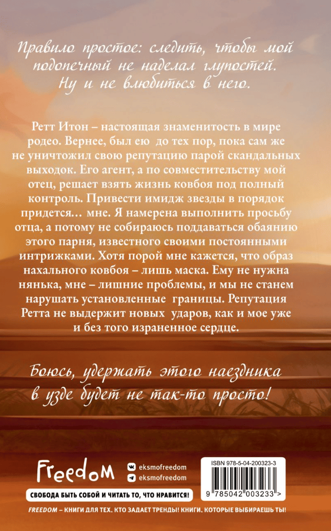 Rhett's reputation as a famous rodeo rider has been jeopardized. Now he is under the care of his agent's strict daughter, who has always had feelings for him. Summer is determined to act professionally, ignoring the sympathy. Will she be able to resist Rhett's charms?