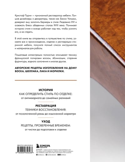 Christophe Pourny learned the art of furniture restoration in his father's workshop in the south of France. In this book, he teaches you everything you need to know about the origins and history of furniture, as well as how to restore, refurbish and care for it - from antiques to mid-century pieces, family heirlooms or quirky sideboards found at flea markets. Full-color photographs and step-by-step workshops make it easy to replicate each restoration technique at home. The guide includes information on the care and maintenance of wood furniture, how to properly clean leather, polish hardware, repair broken parts, and replace felt pads, as well as recipes for making your own wax, shellac, varnish, stain, and more.