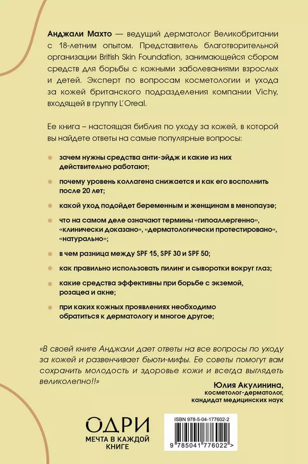 Anjali Mahto is a leading UK dermatologist with 18 years' experience. She is a representative of the British Skin Foundation, a charity that raises funds to fight skin diseases in adults and children. Cosmetic and skincare expert for the UK division of Vichy, part of the L'Oreal group. Her book is a real skincare bible, with answers to the most popular questions.