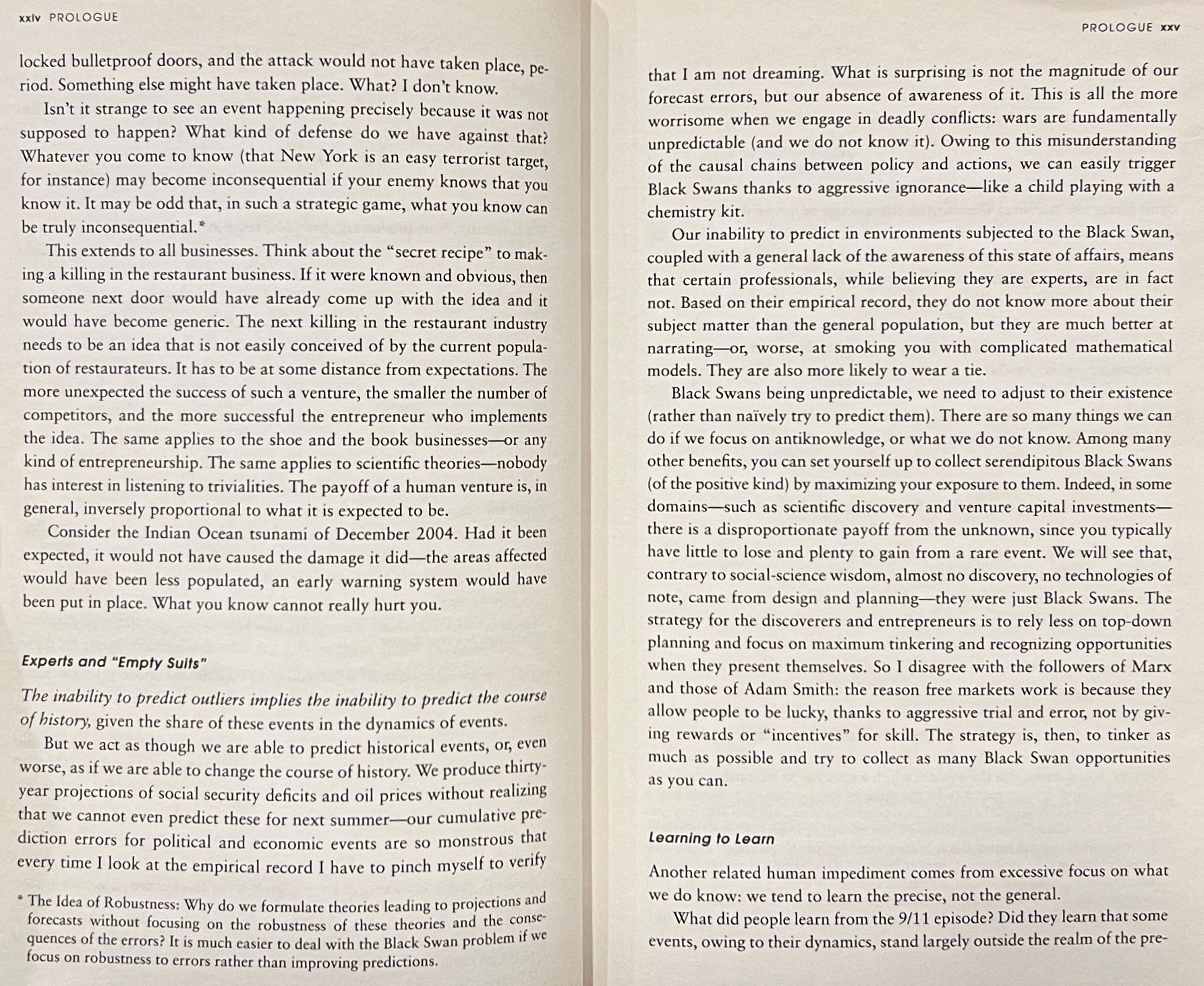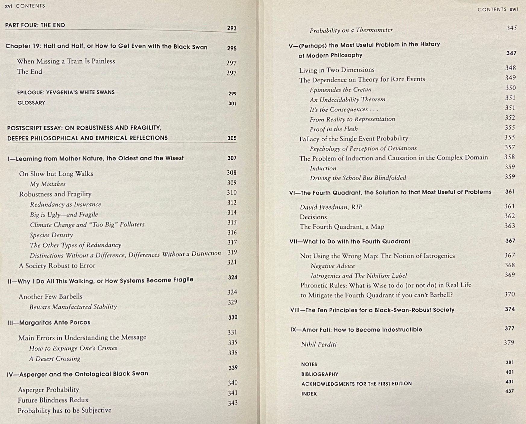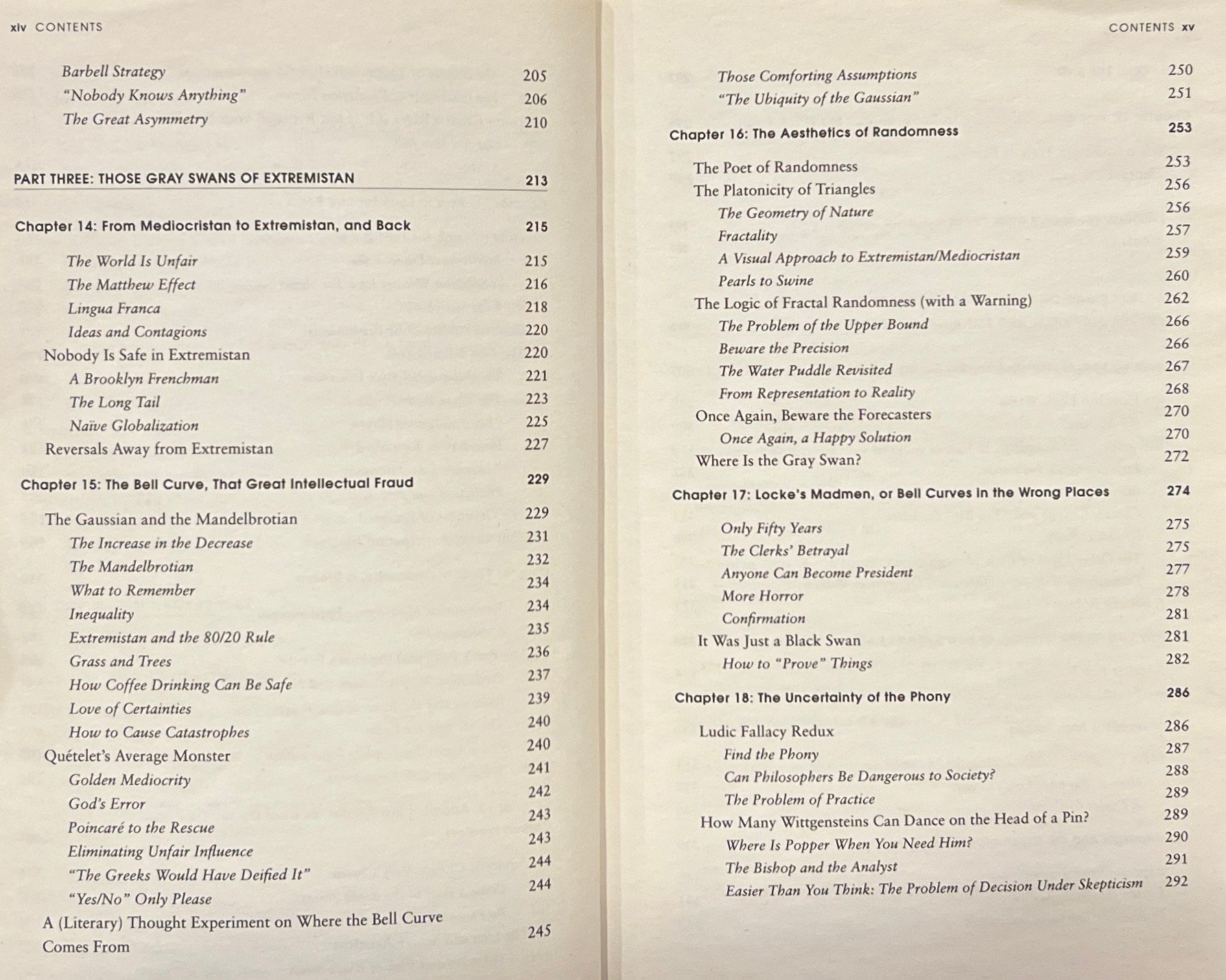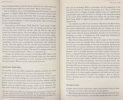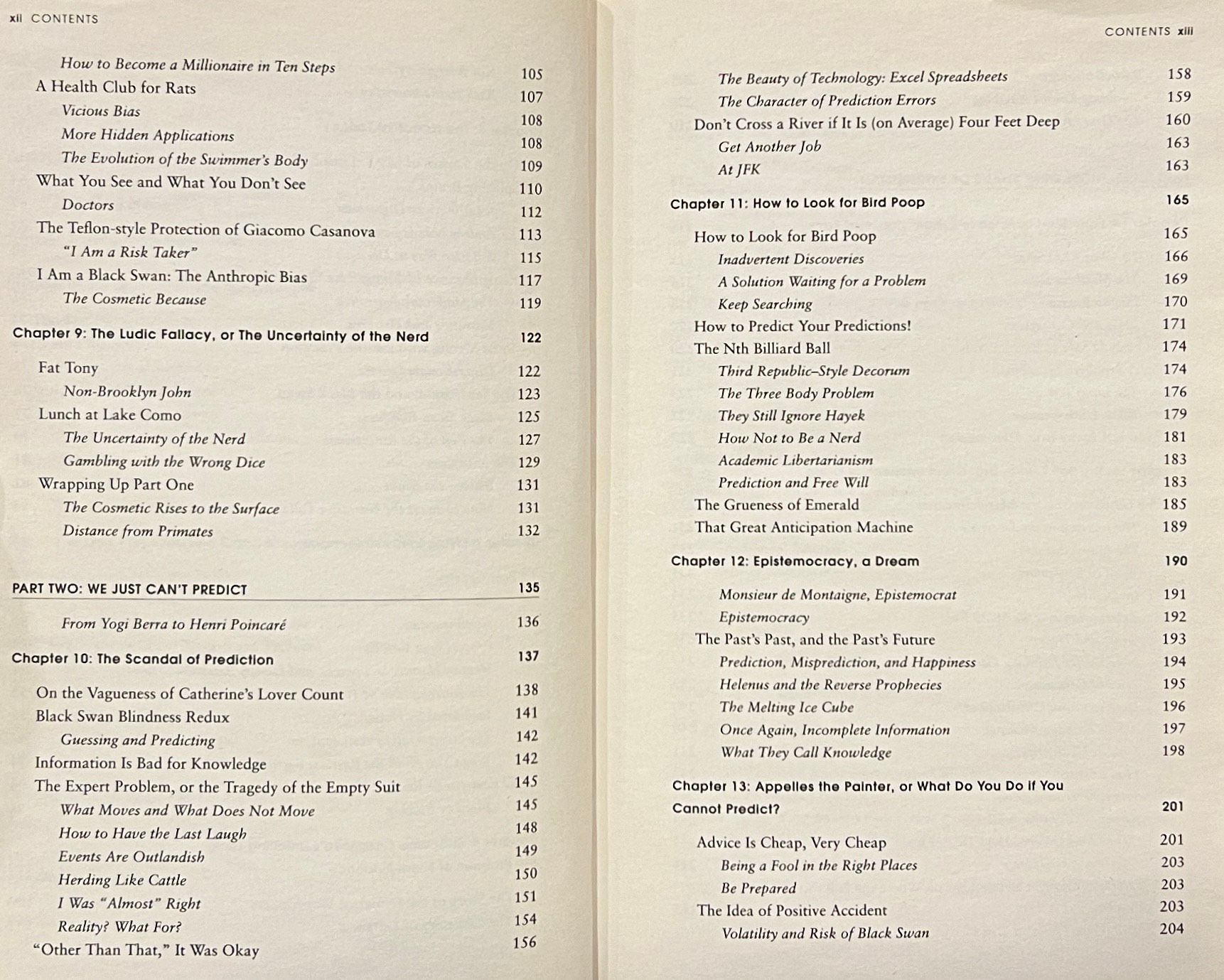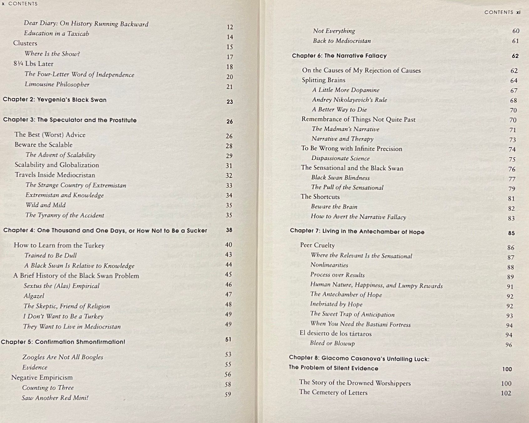 In Black Swan: The Impact of The Highly Improbable, the author projects randomness and uncertainty as a single idea. He puts forth a theory that promotes the idea and value of a society that stands robust in the face of negative events, and manipulates the positive ones to its advantage.According to Taleb, a Black Swan event is a rare event that has large magnitude and powerful consequences owing to its unpredictability. Such an event is initially a surprise to its observer, but is rationalized by him/her in retrospect. World War I, the rise of the Internet, and the 9/11 attacks on the World Trade Center are cited as examples of Black Swan events. Taleb introduces a fictional character called Yevgenia Nikolayevna Krasnova to elucidate his theory. Krasnova is a neuroscientist, who is interested in philosophy. She writes a book called A Story Of Recursion. A small publishing firm picks up the book and publishes it in its unedited form. In an unexpected turn of events, the book goes on to become an international bestseller, catapulting the author and the publishing firm to fame. This event is described as a Black Swan Event.The book is divided into four parts. Part 1 and the first section of Part 2 deal with psychology. The author then moves on to the subjects of science and business in the later part of Part 2 and the whole of Part 3. Part 4 provides strategies to enjoy life amidst all the uncertainties in the world. The book was first released in 2007 and went on to become extremely successful. It was listed by The Sunday Times as one of the 12 most influential books post World War II. It stayed on The New York Times bestseller list for 36 weeks. It was published in 32 languages, and sold almost 3 million copies as of February 2011.